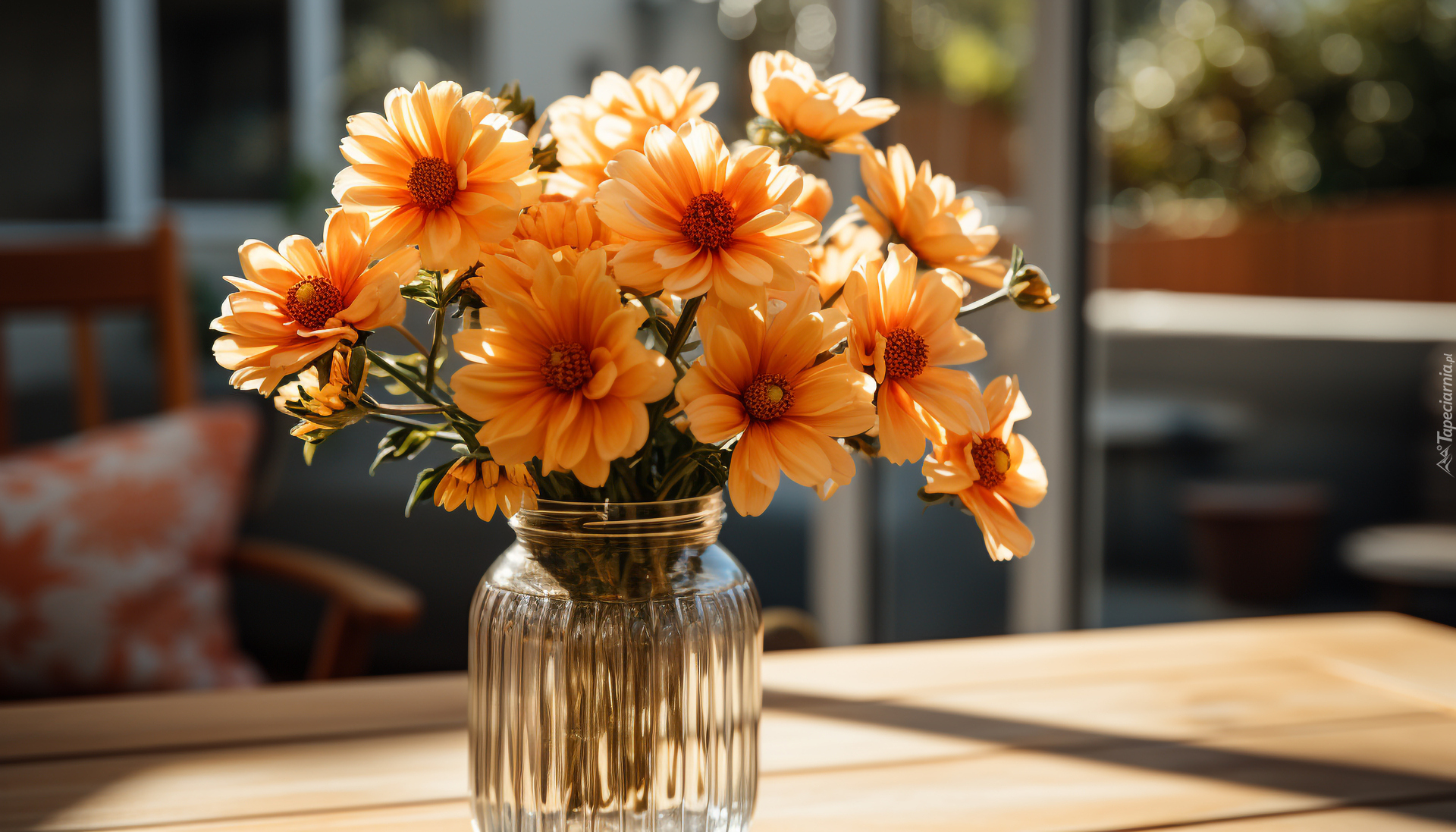 Edytor tapety: Rozświetlone pomarańczowe kwiaty w wazonie na stole