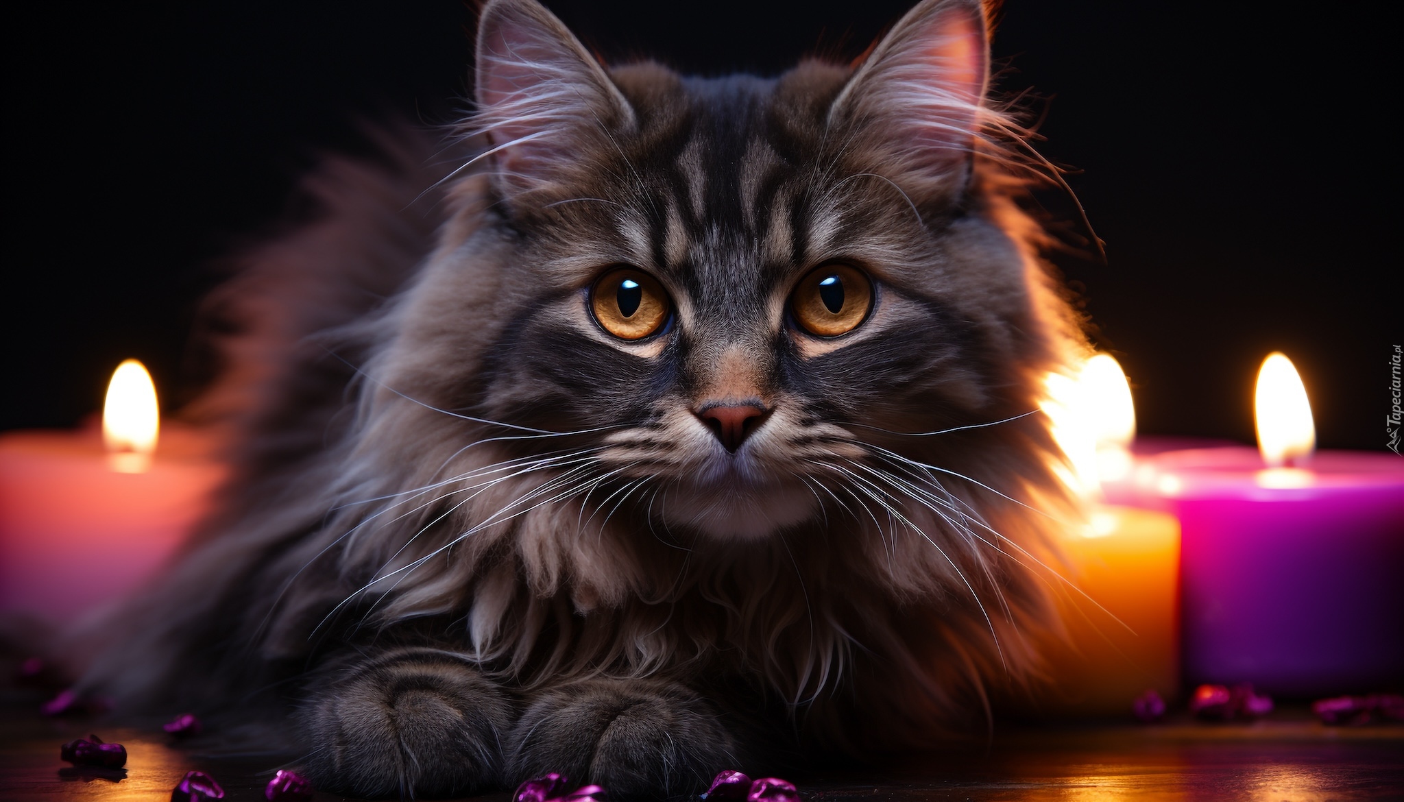 Edytor tapety: Płonące świece i puszysty kot