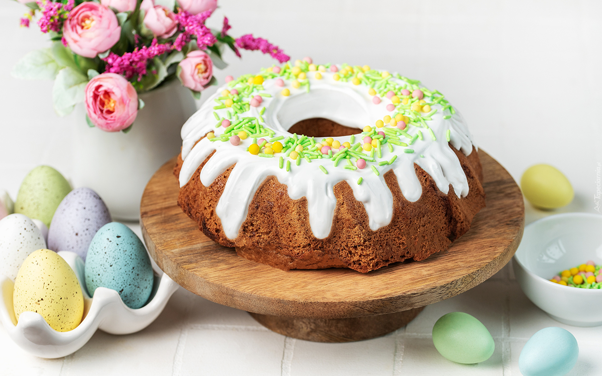 Edytor tapety: Lukrowana babka na desce obok pisanek i kwiatków