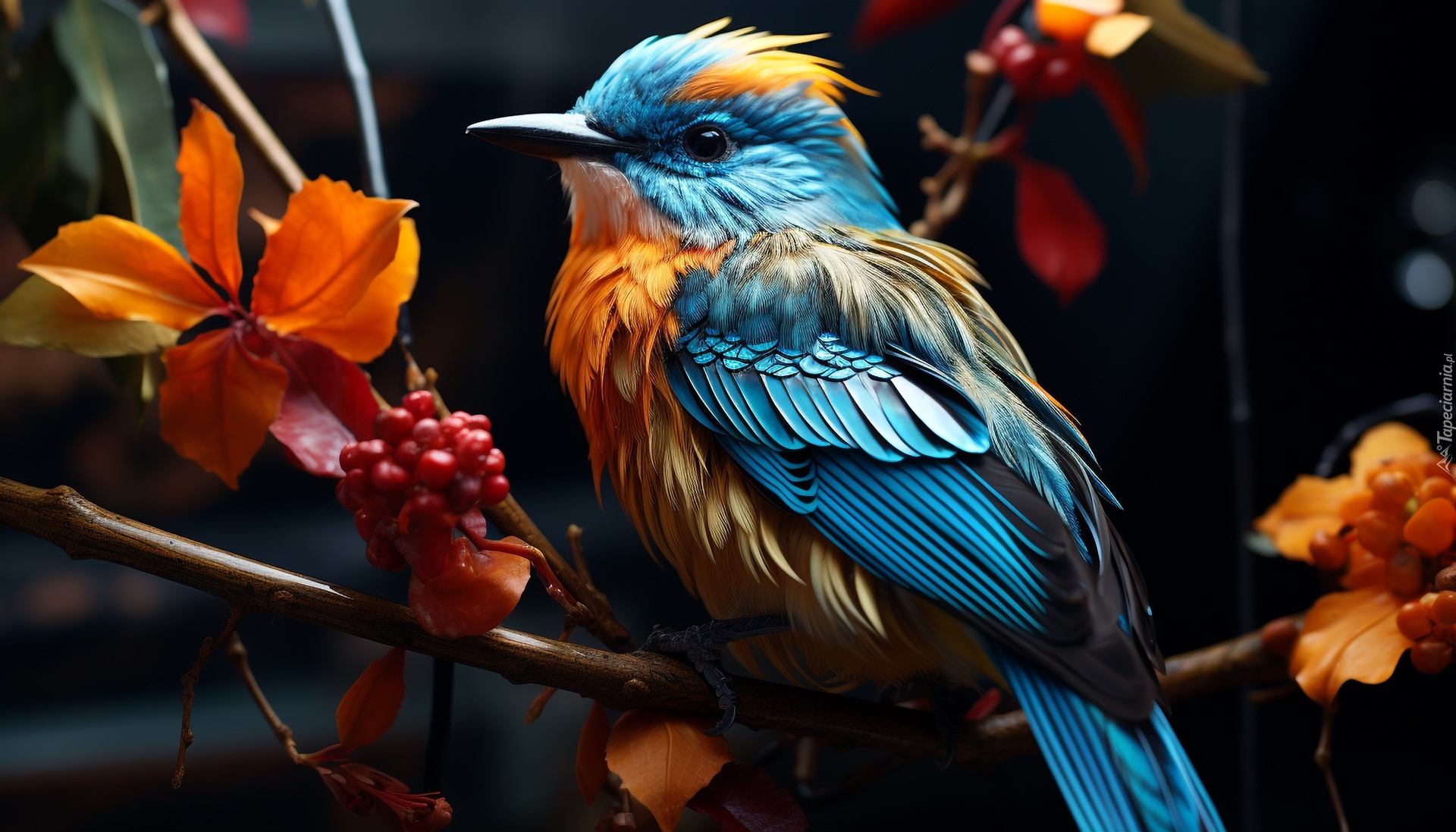 Edytor tapety: Kolorowy ptak na ukwieconej gałązce na ciemnym tle