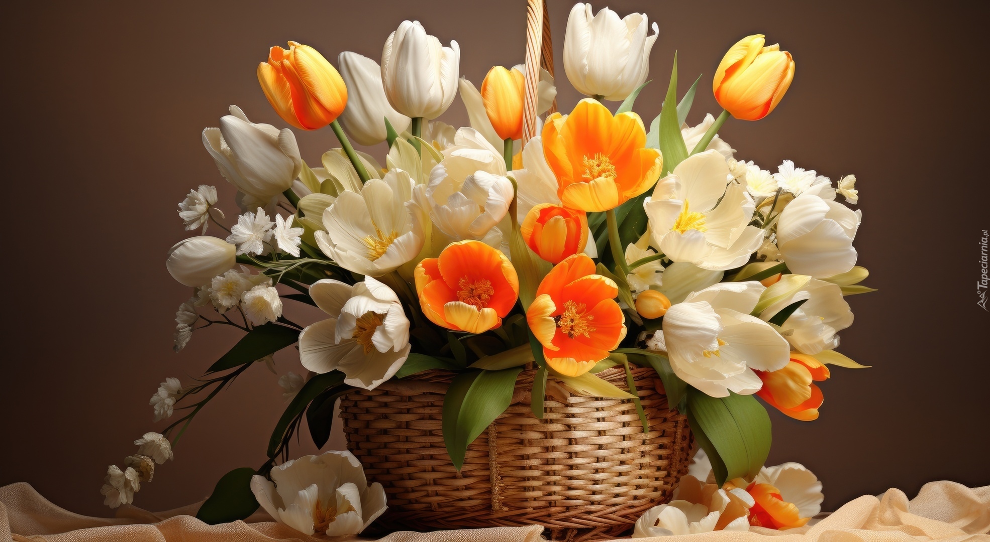 Edytor tapety: Rozwinięte białe i pomarańczowe tulipany w wiklinowym koszyku