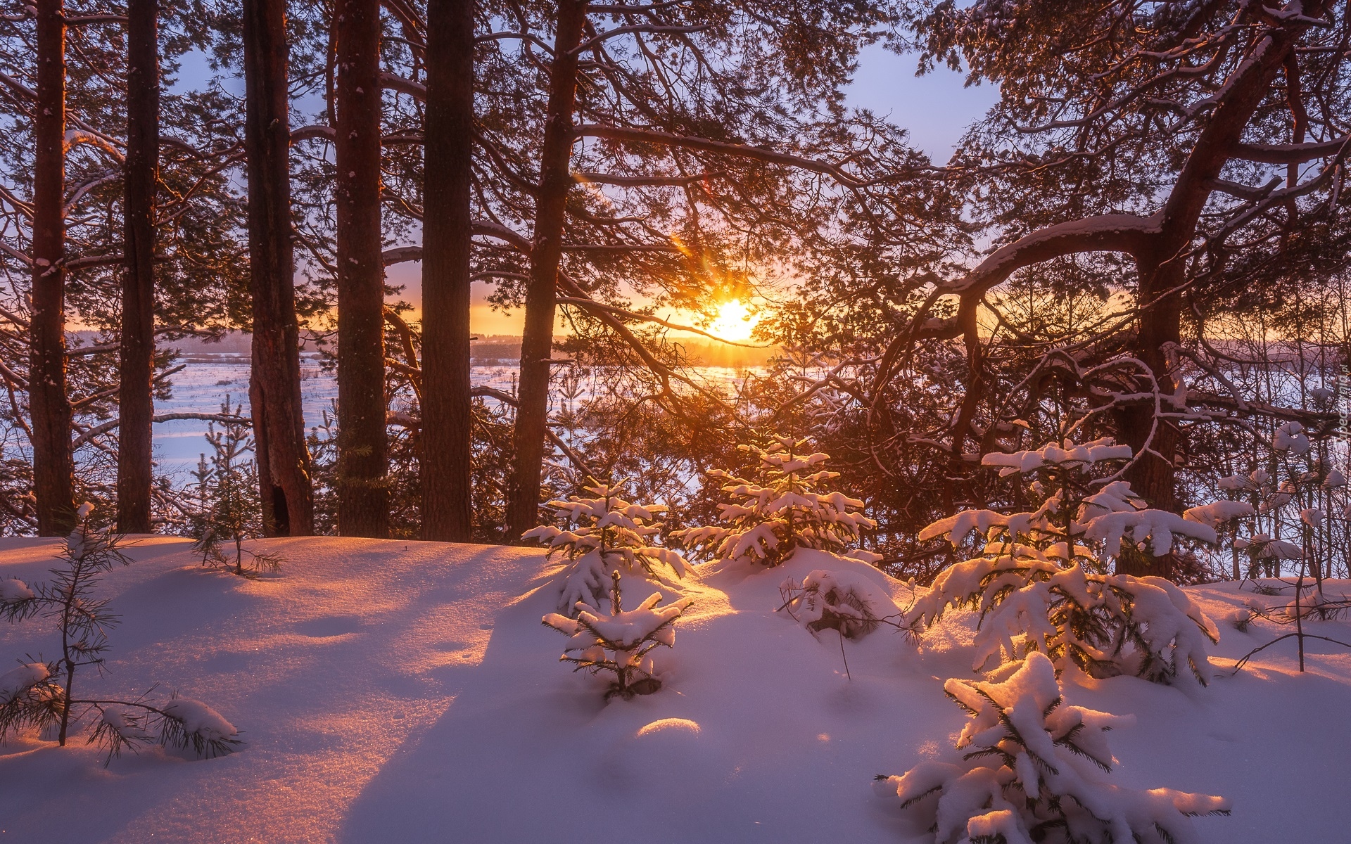 Edytor tapety: Rozświetlone zachodzącym słońcem drzewa w śniegu