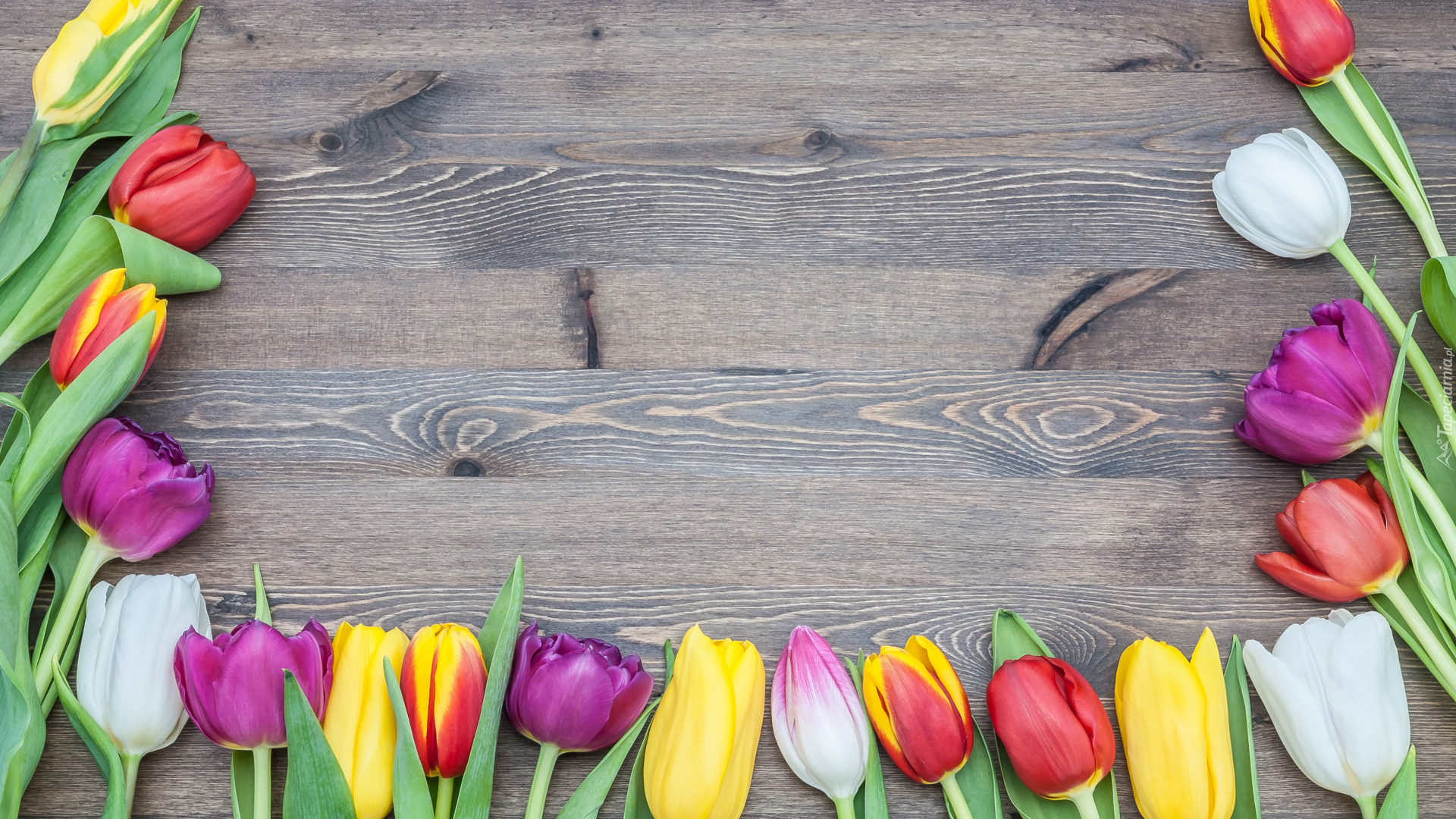 Edytor tapety: Różnokolorowe tulipany na deskach