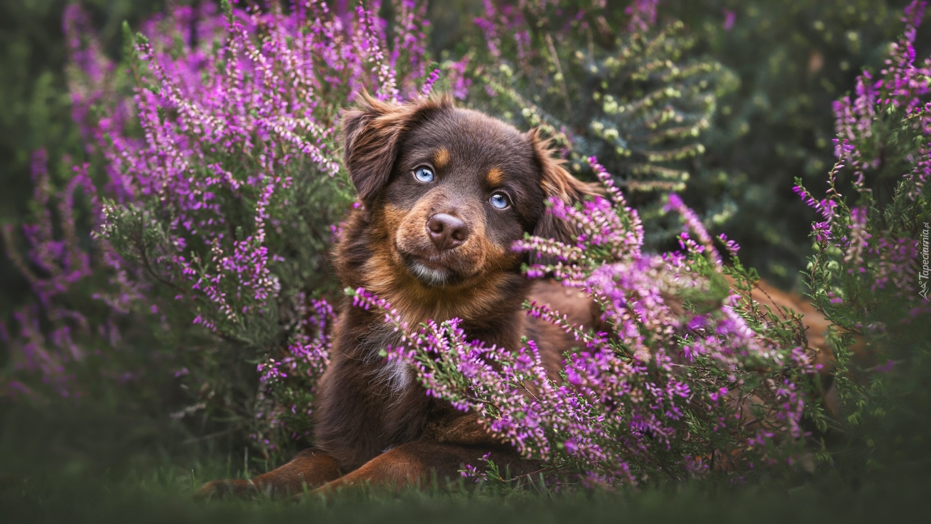 Edytor tapety: Szczeniak wśród kwitnącego wrzosu