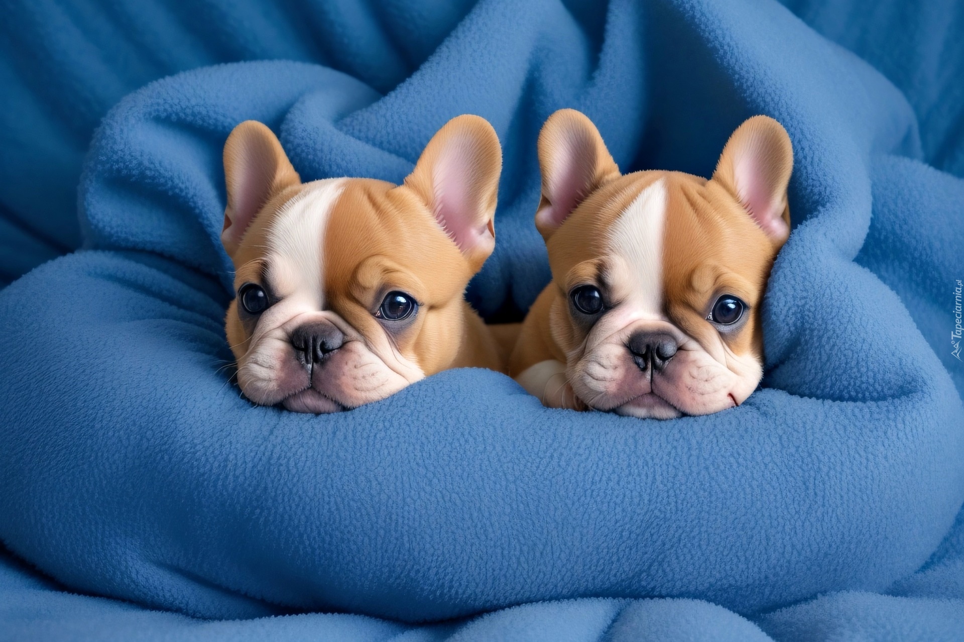 Edytor tapety: Dwa szczeniaki buldoga francuskiego na niebieskim kocu