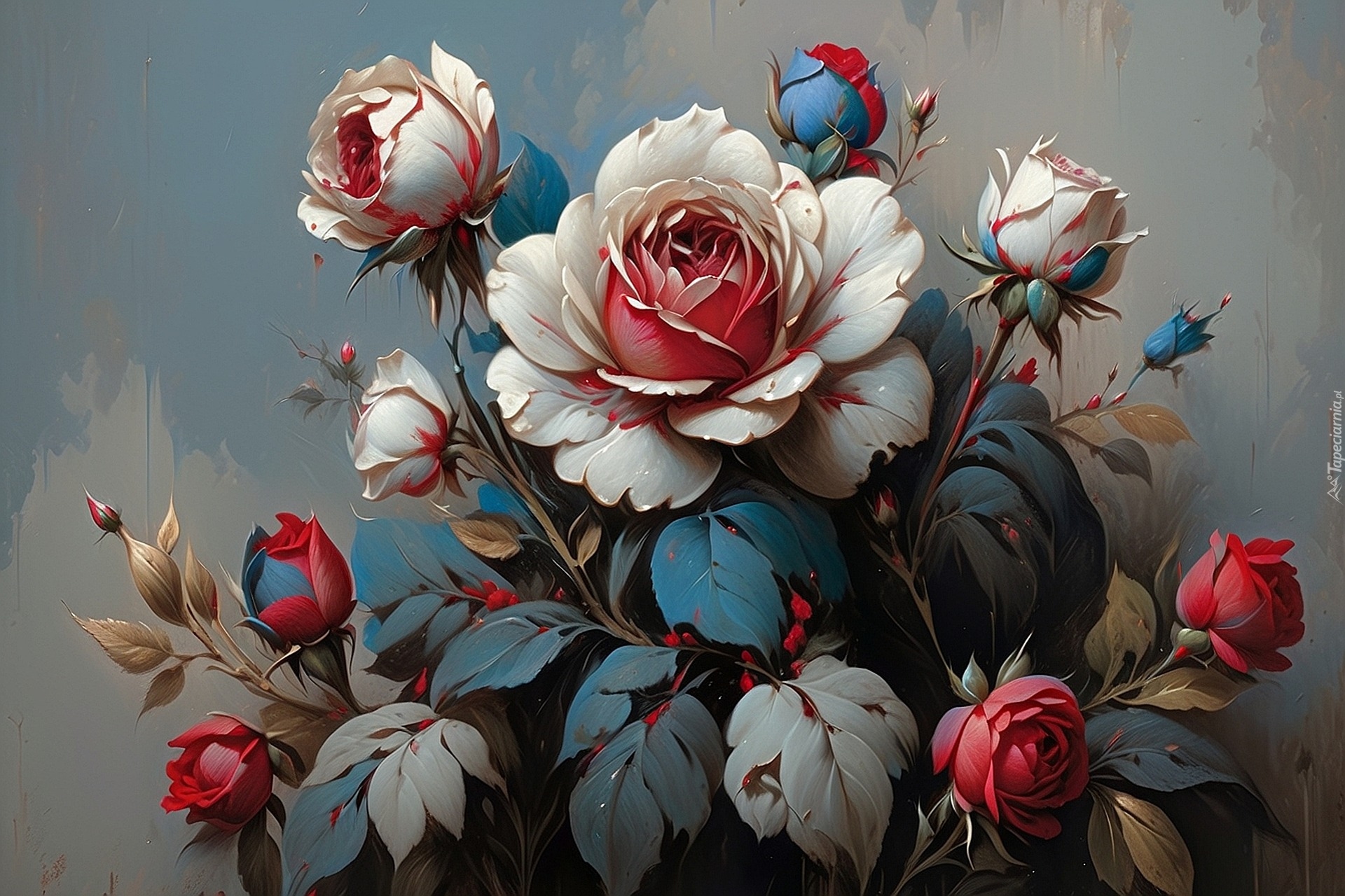 Edytor tapety: Kolorowe róże z pąkami na szarym tle