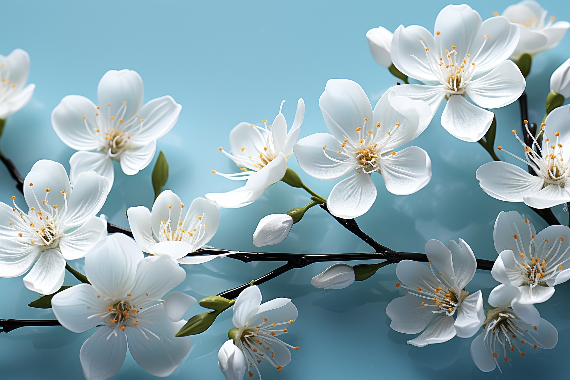 Edytor tapety: Gałązka z białymi kwiatkami na błękitnym tle