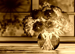 Edytor tapety: Kolorowe piwonie w szklanym wazonie przy oknie