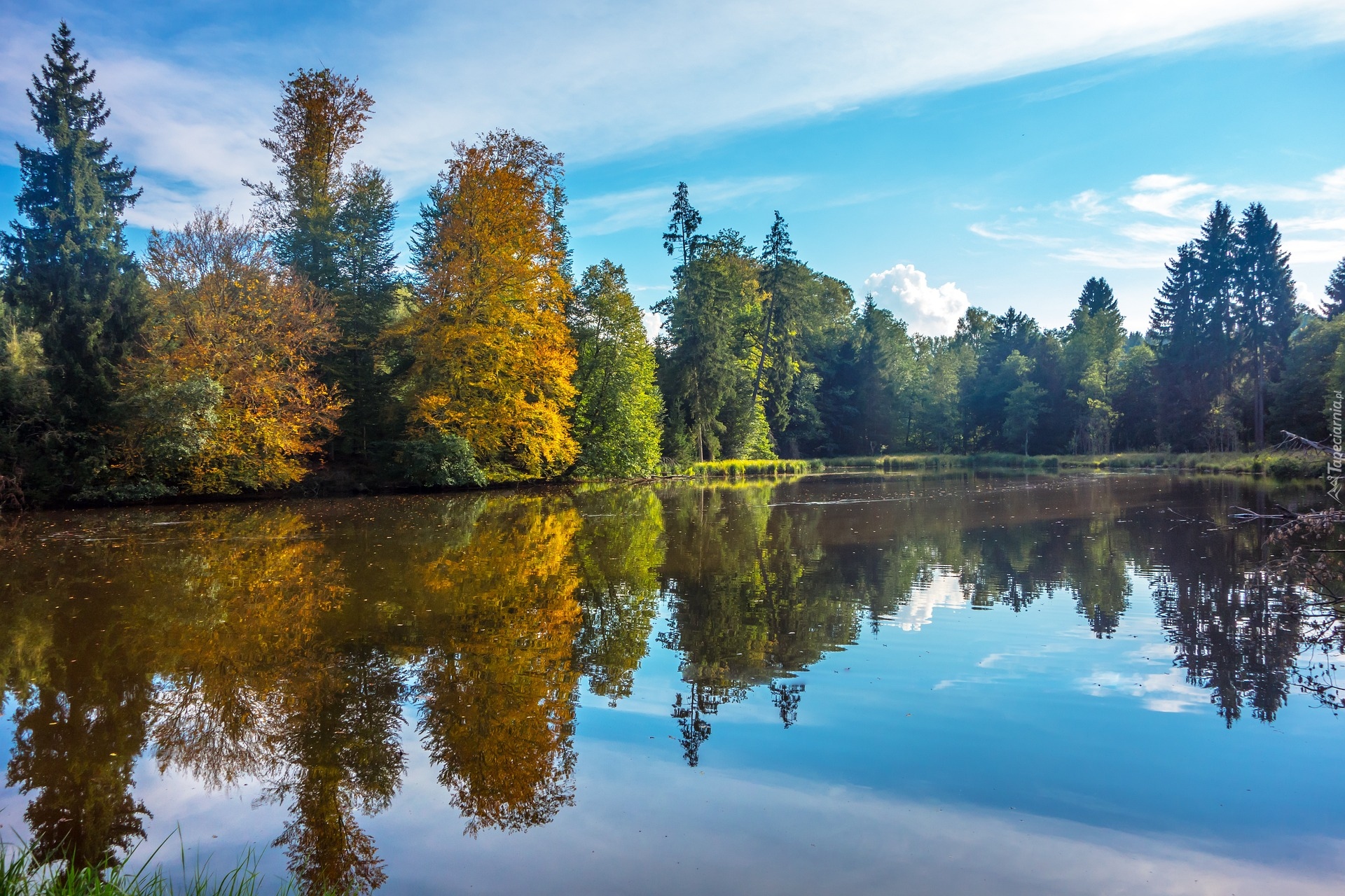 Edytor tapety: Odbicie jesiennych drzew w stawie