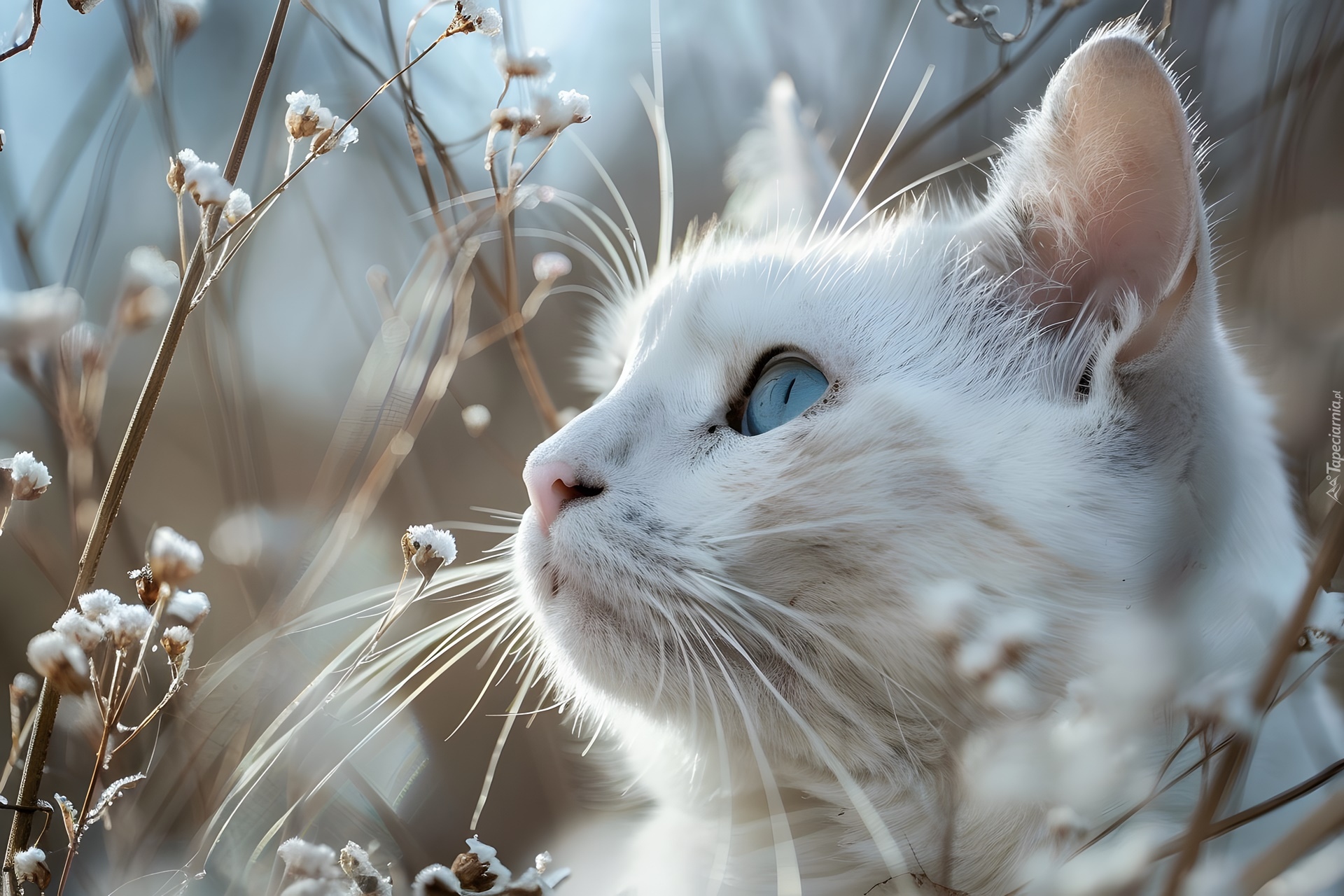 Edytor tapety: Głowa białego kota wśród suchych roślin