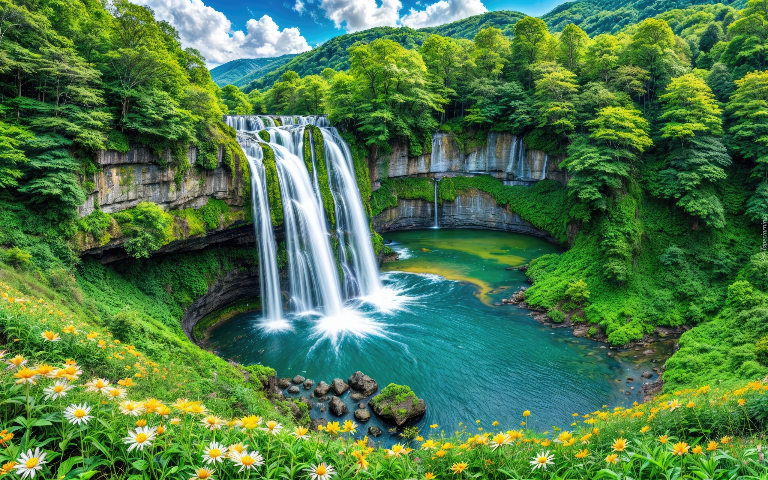 Edytor tapety: Kwiaty i drzewa przy skalnym wodospadzie