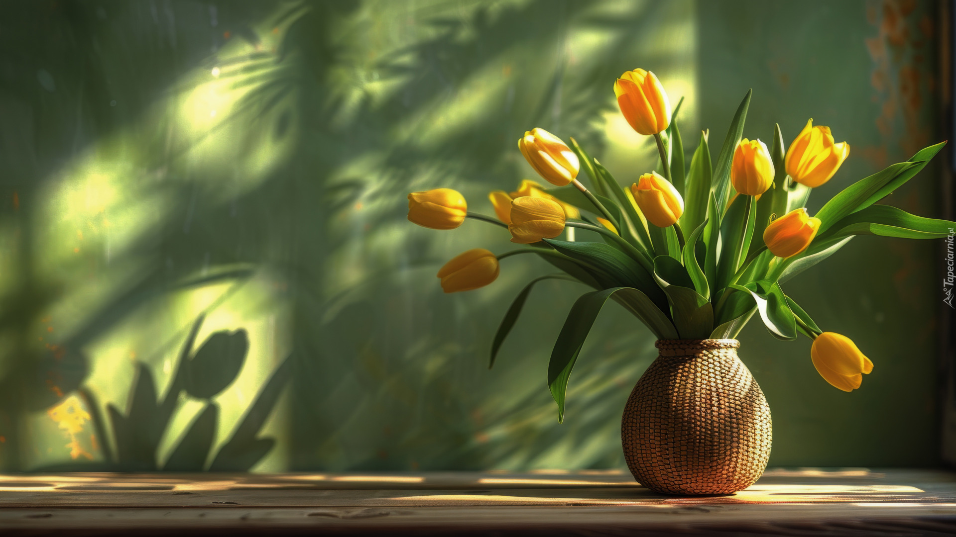 Edytor tapety: Bukiet żółtych tulipanów w wazonie