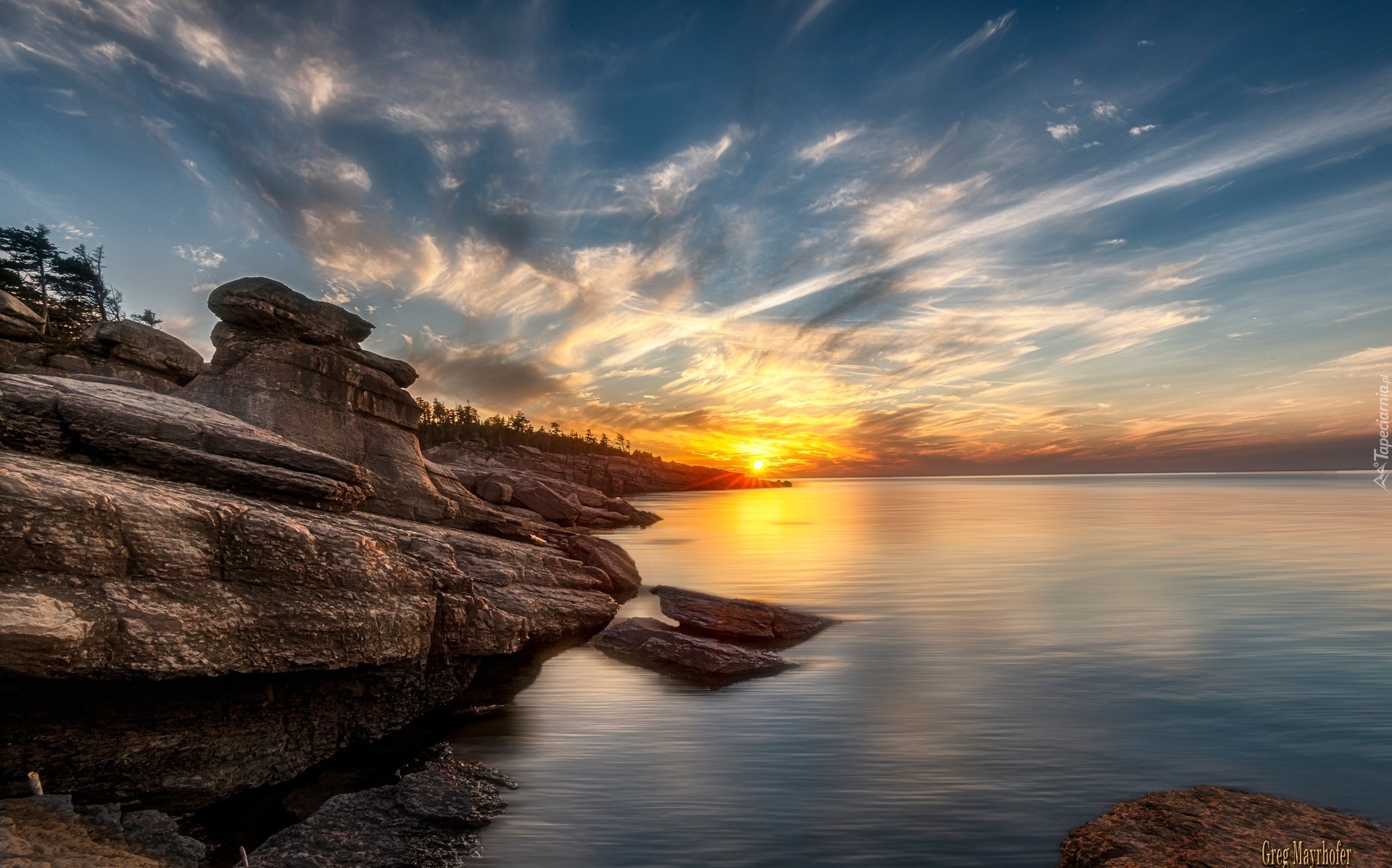 Edytor tapety: Skały na brzegu morza w blasku wschodzącego słońca