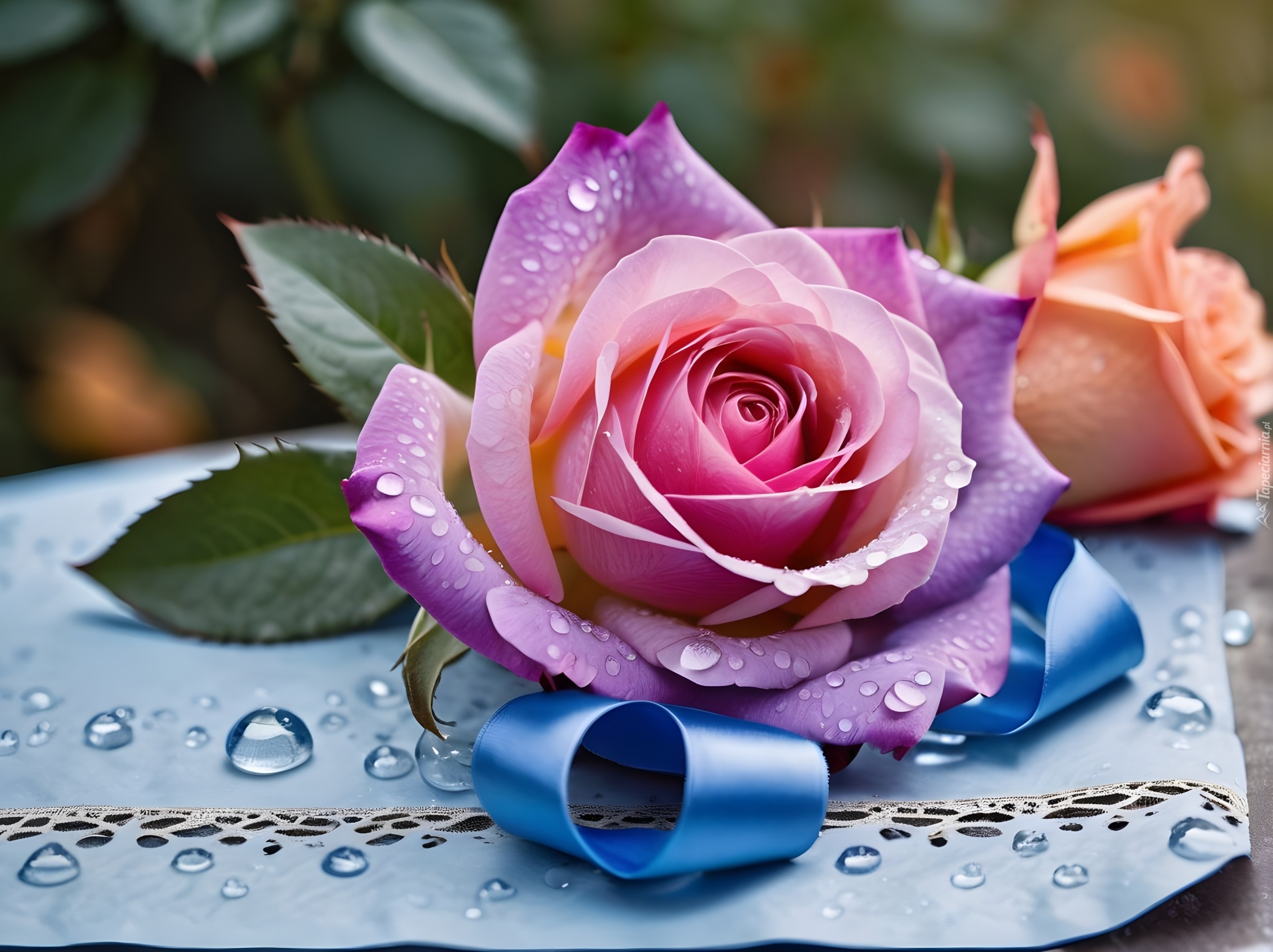 Edytor tapety: Kolorowe róże na serwetce i krople wody