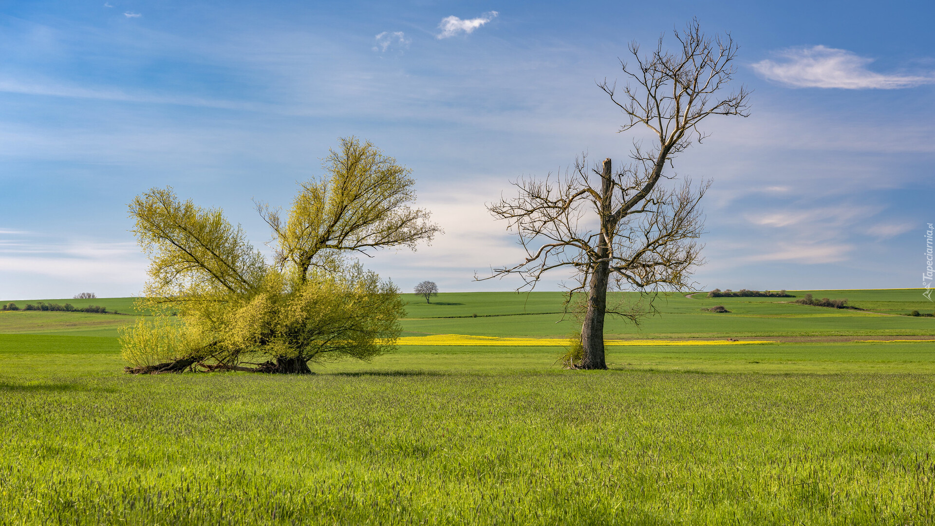 Edytor tapety: Suche drzewo obok drzewa z liśćmi na polu