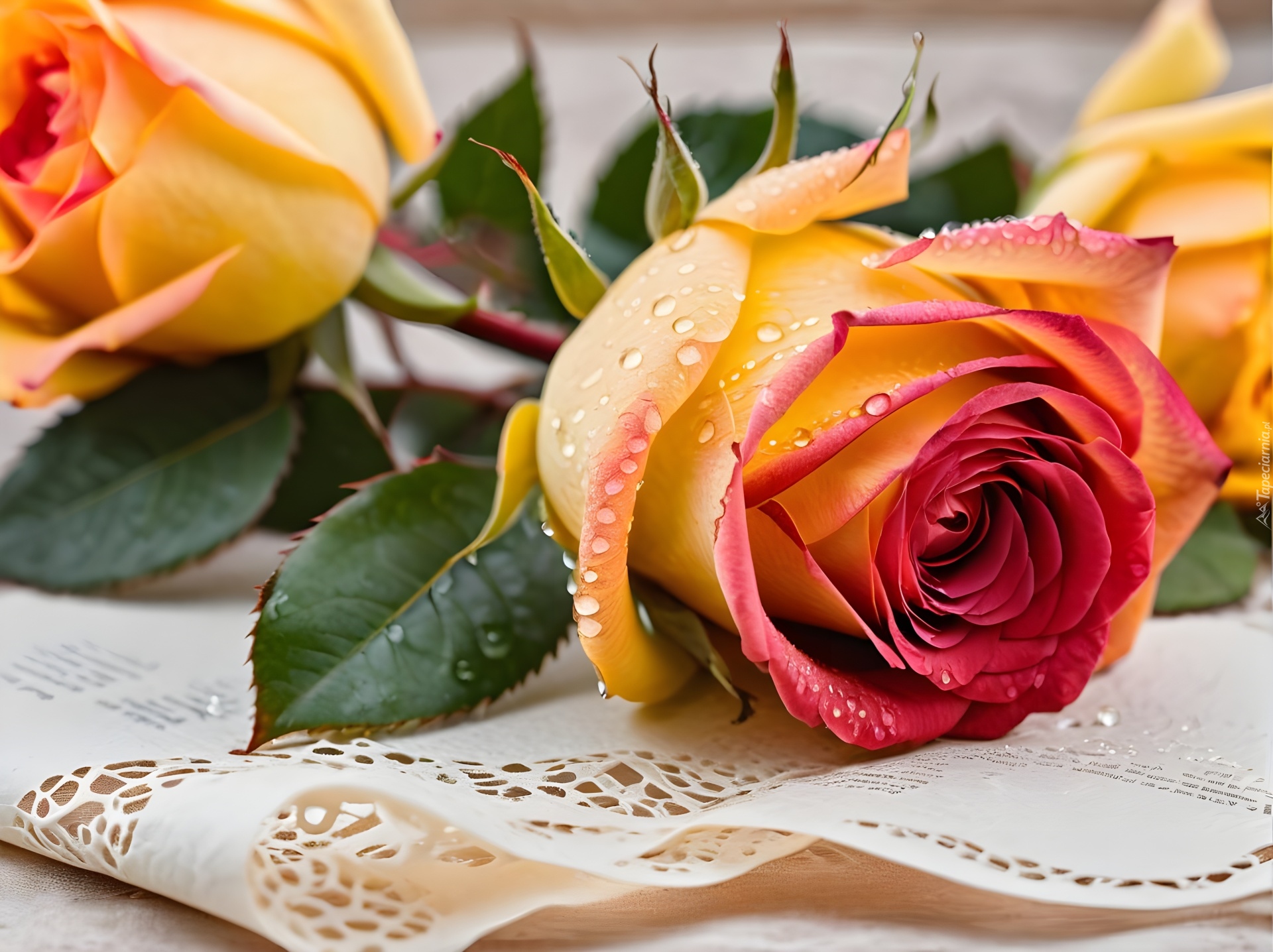 Edytor tapety: Róże z kroplami wody na serwetce