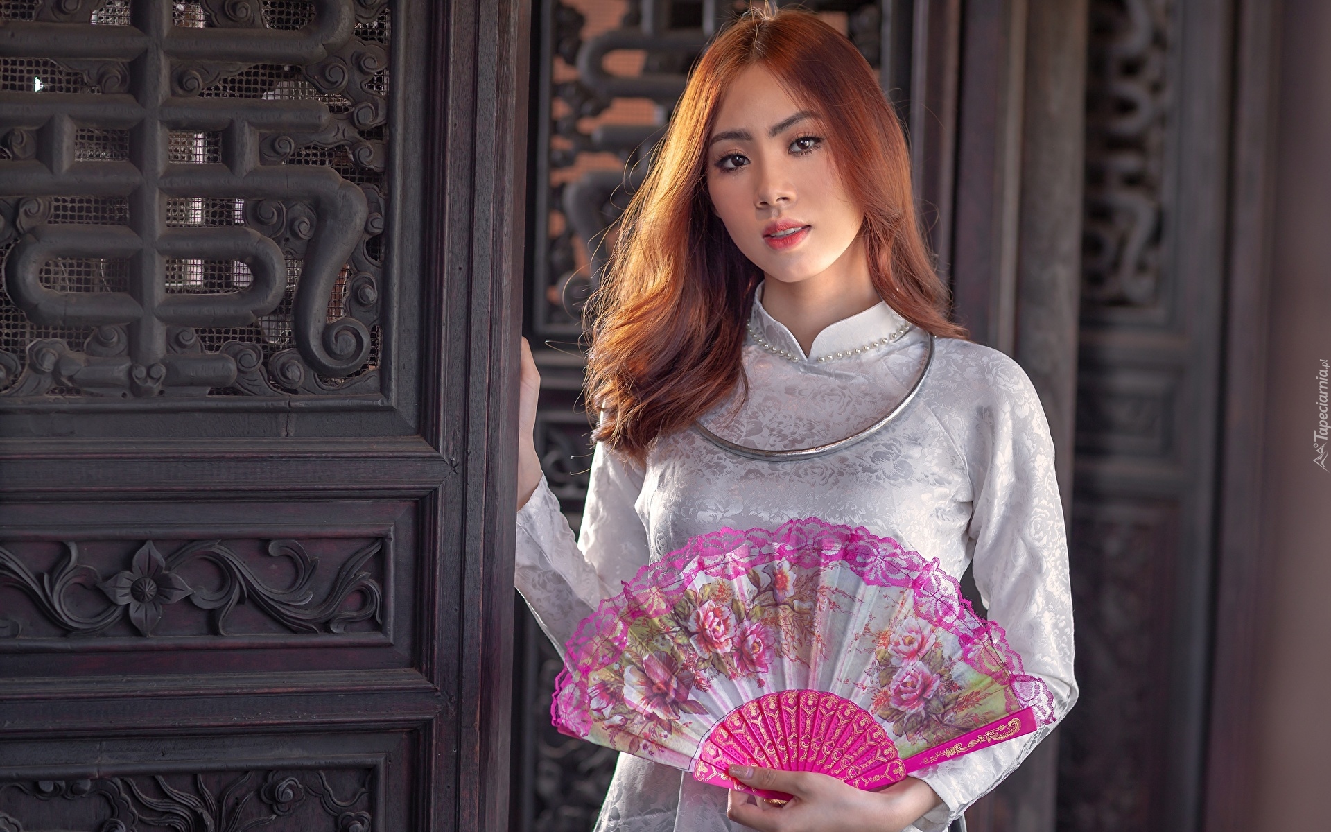 Edytor tapety: Dziewczyna przy drzwiach z wachlarzem