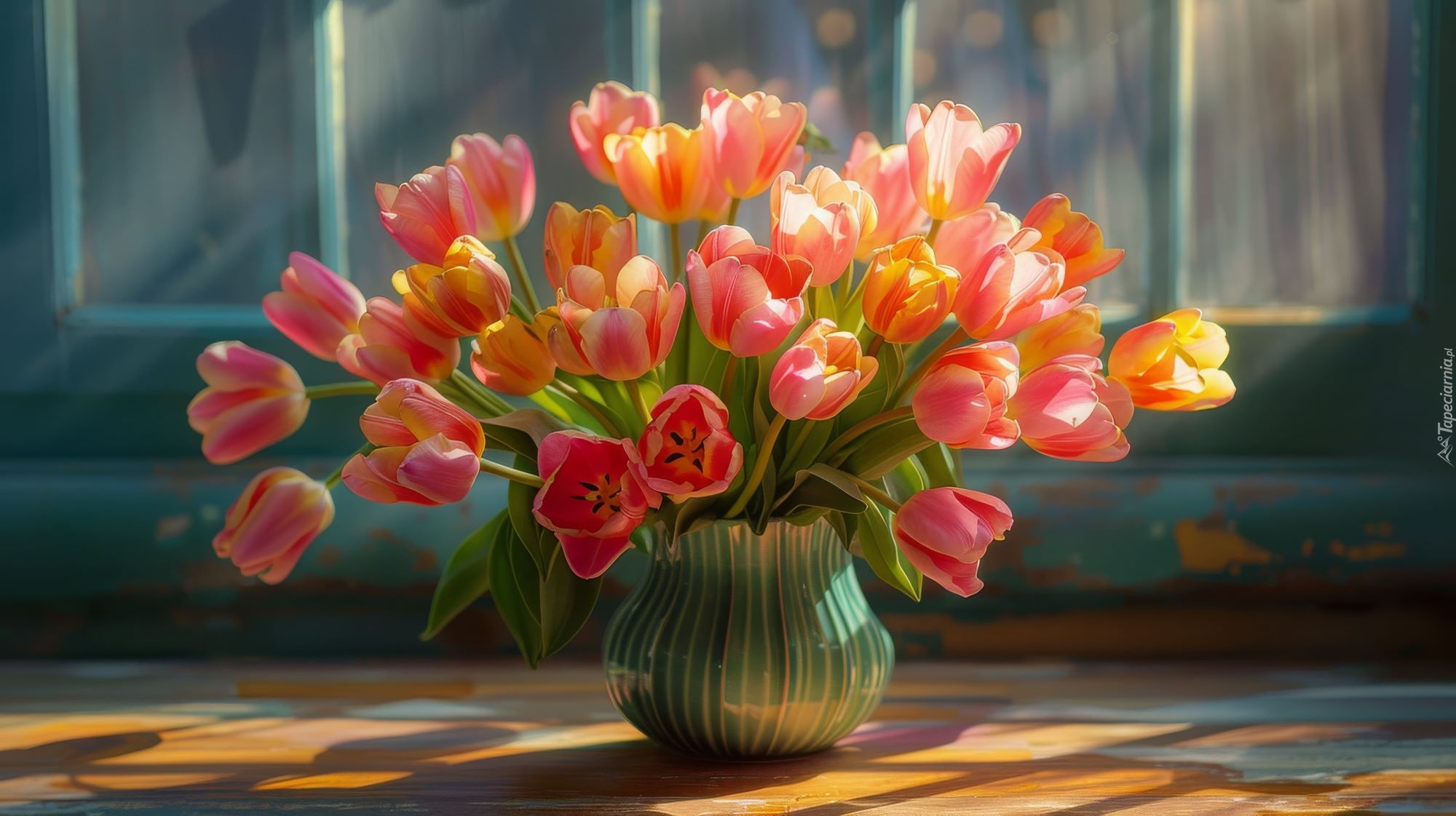 Edytor tapety: Kolorowy bukiet tulipanów w wazonie przy oknie