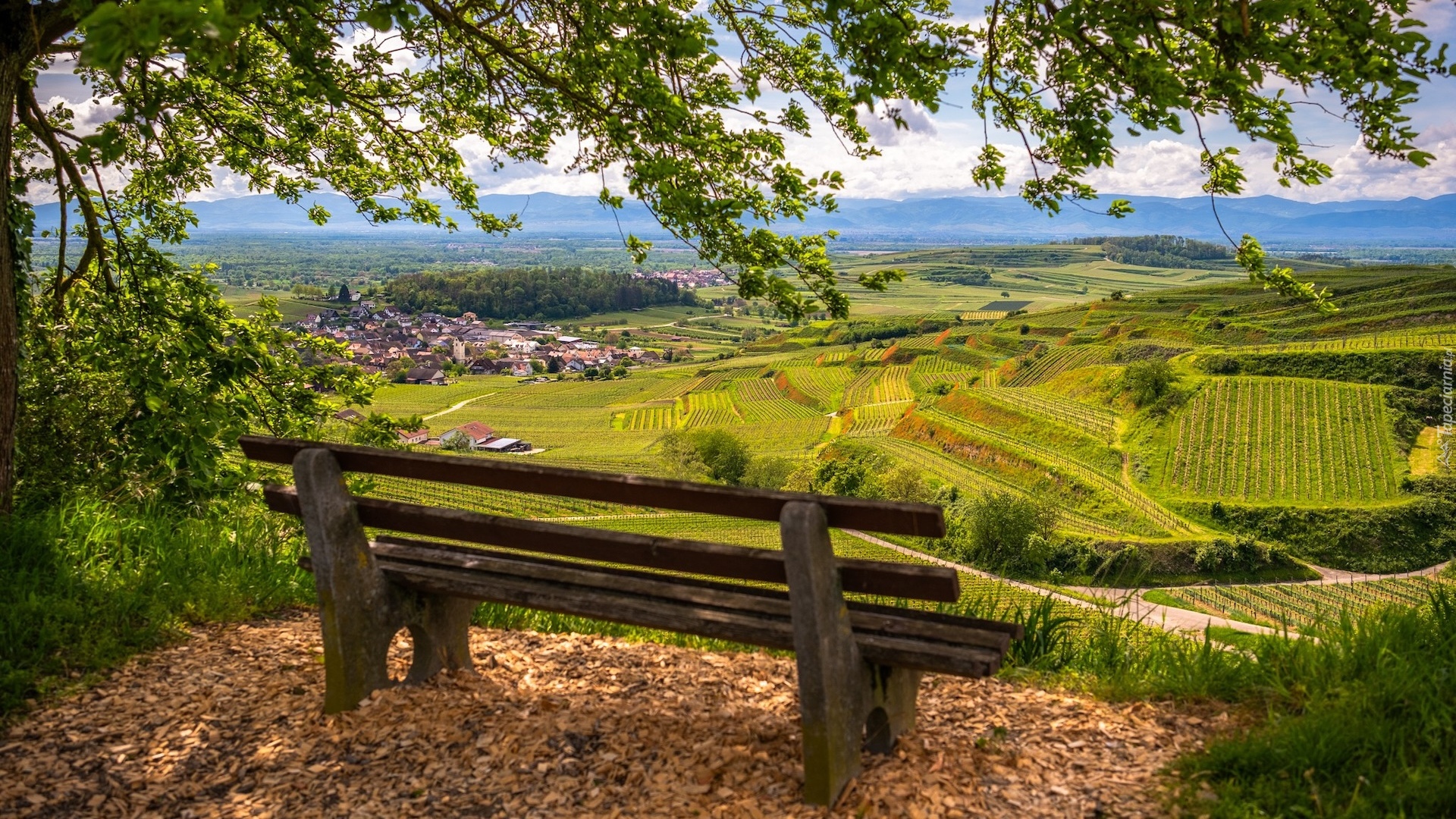 Edytor tapety: Ławka na wzgórzu z widokiem na pola