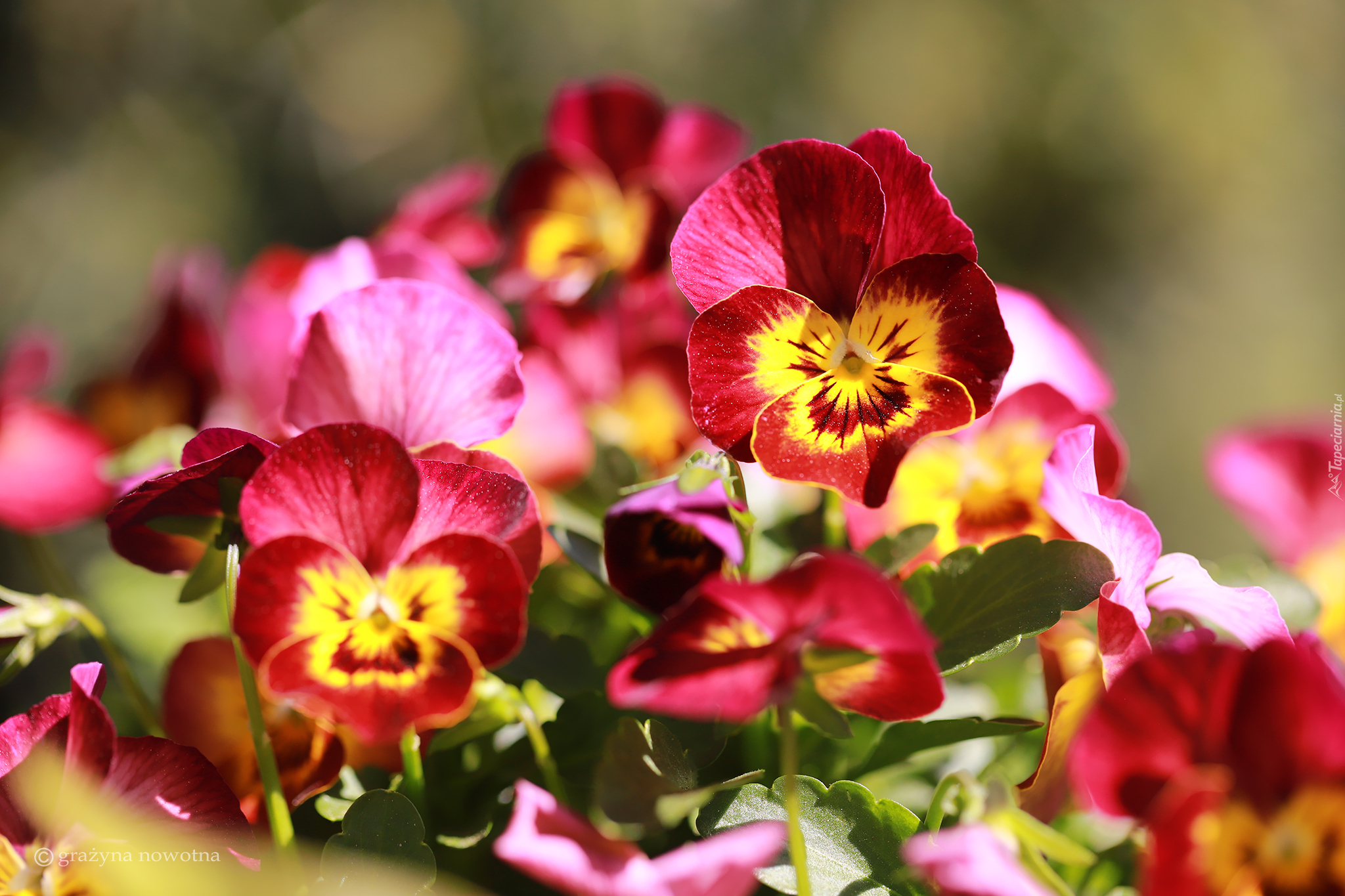 Edytor tapety: Dwukolorowe bratki w słonecznym blasku