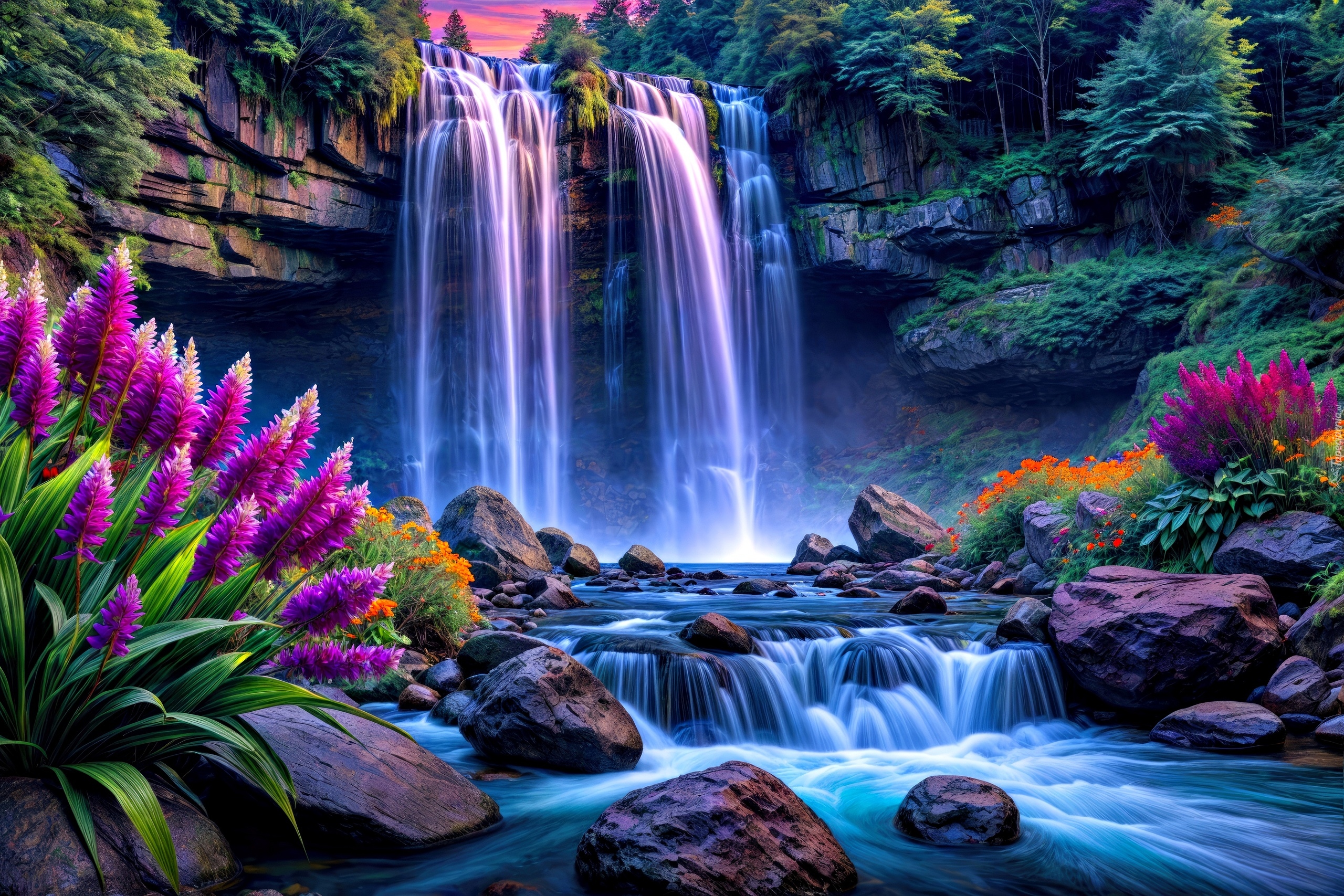 Edytor tapety: Kwiaty na skałach nad rzeką i wodospad