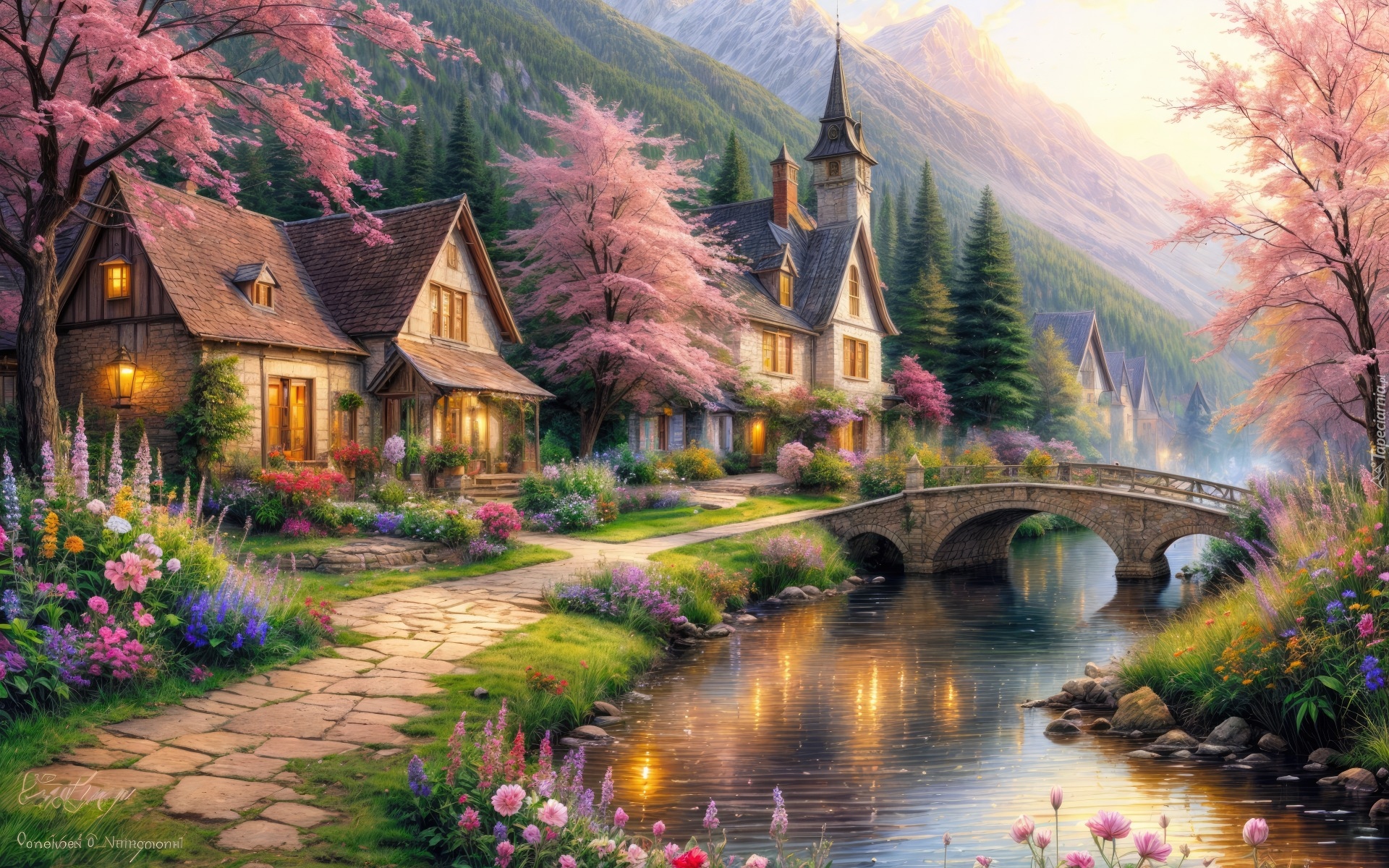 Edytor tapety: Kwiaty i drzewa przy domach nad rzeką