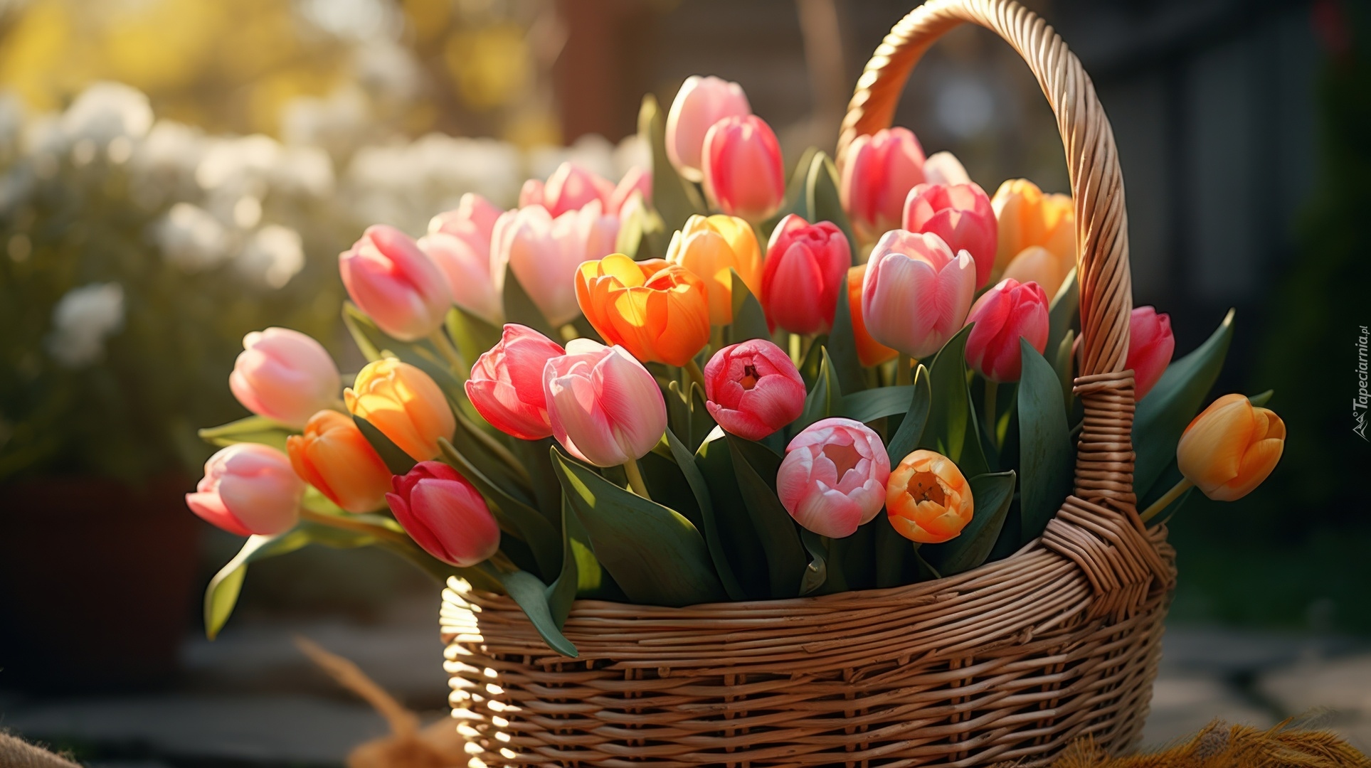 Edytor tapety: Wiklinowy kosz pełen kolorowych tulipanów
