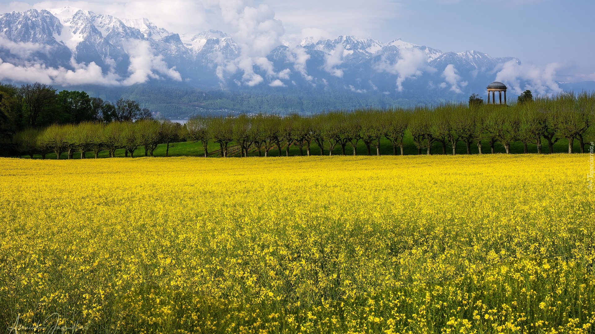 Edytor tapety: Pole kwitnącego rzepaku na tle gór