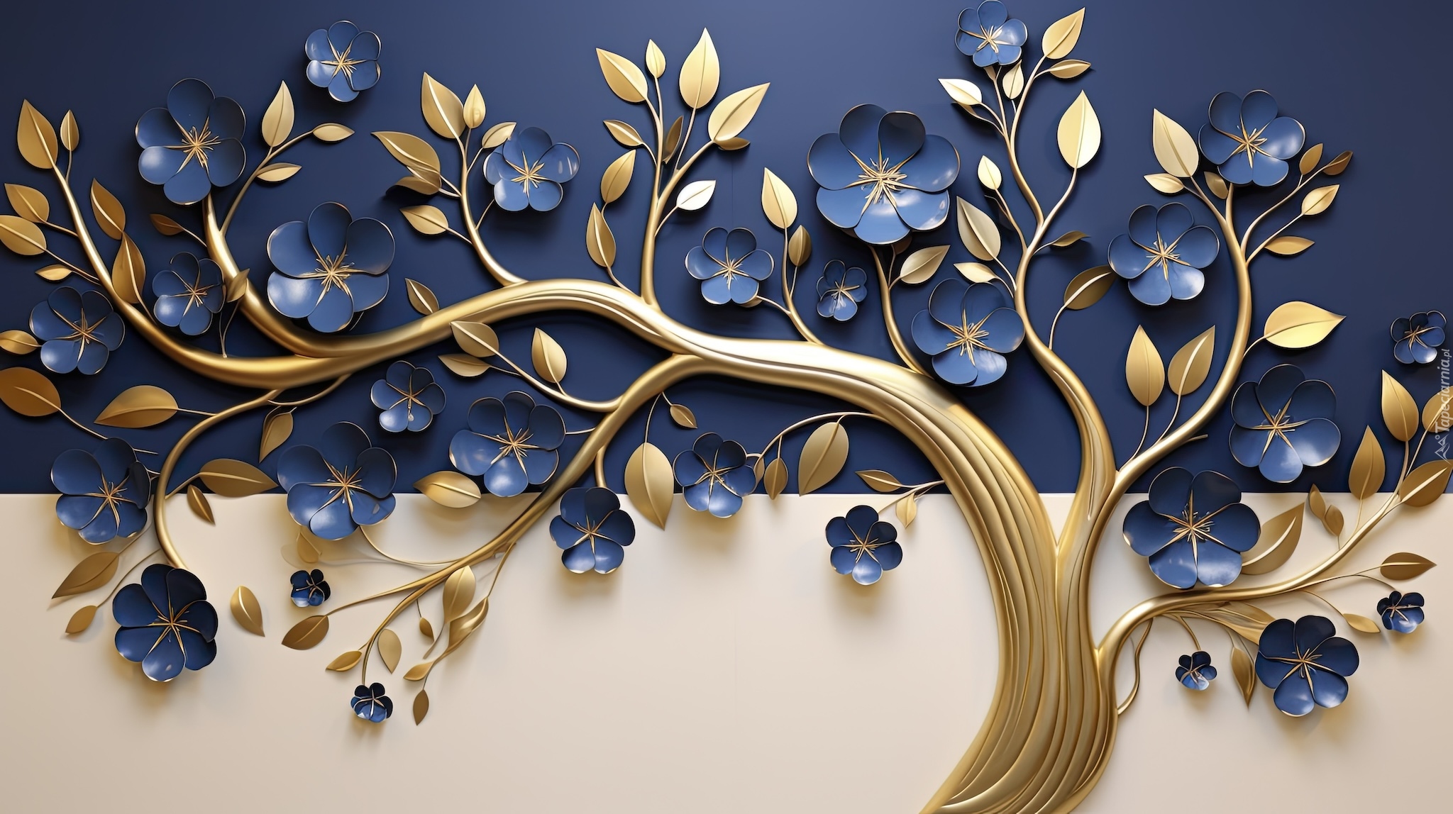 Edytor tapety: Złota gałązka z kwiatkami na dwukolorowym tle