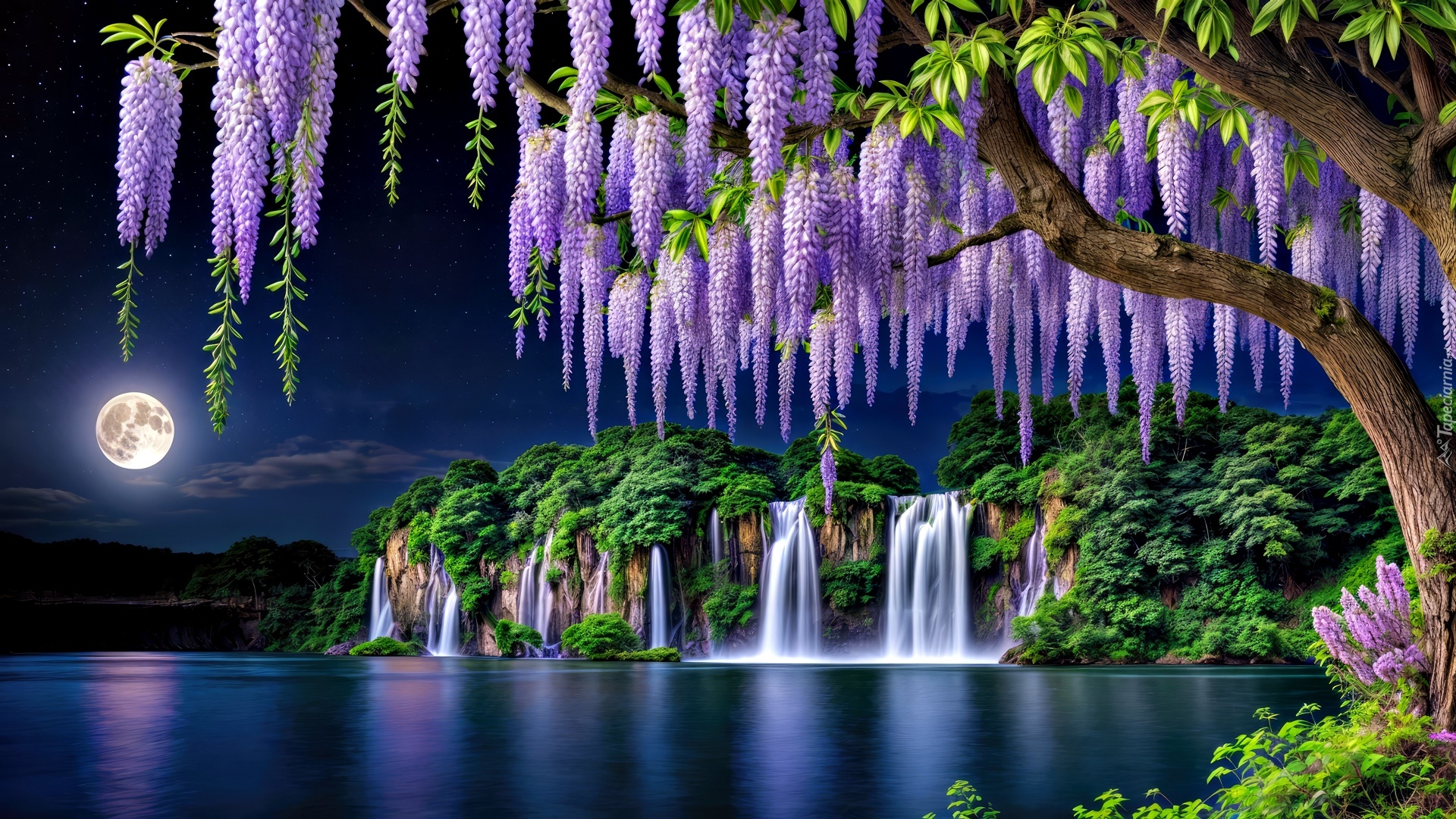 Edytor tapety: Wodospady i glicynia nad jeziorem w blasku księżyca