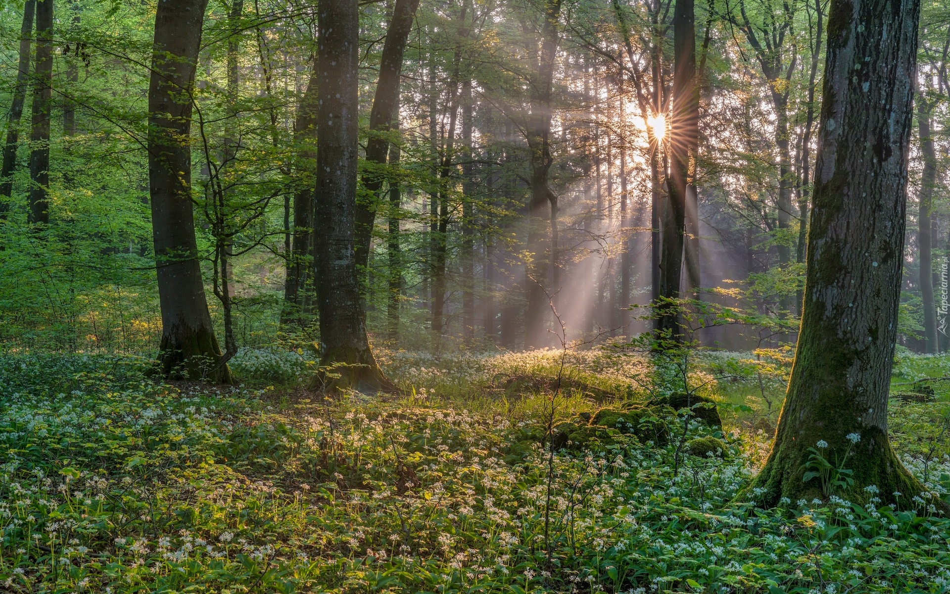 Edytor tapety: Rozświetlony promieniami słońca czosnek niedźwiedzi pod drzewami