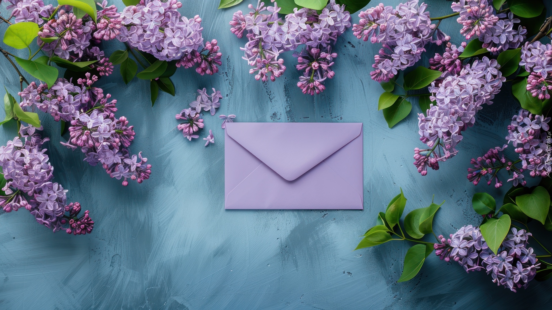 Edytor tapety: Fioletowa koperta i gałązki bzu na niebieskim tle