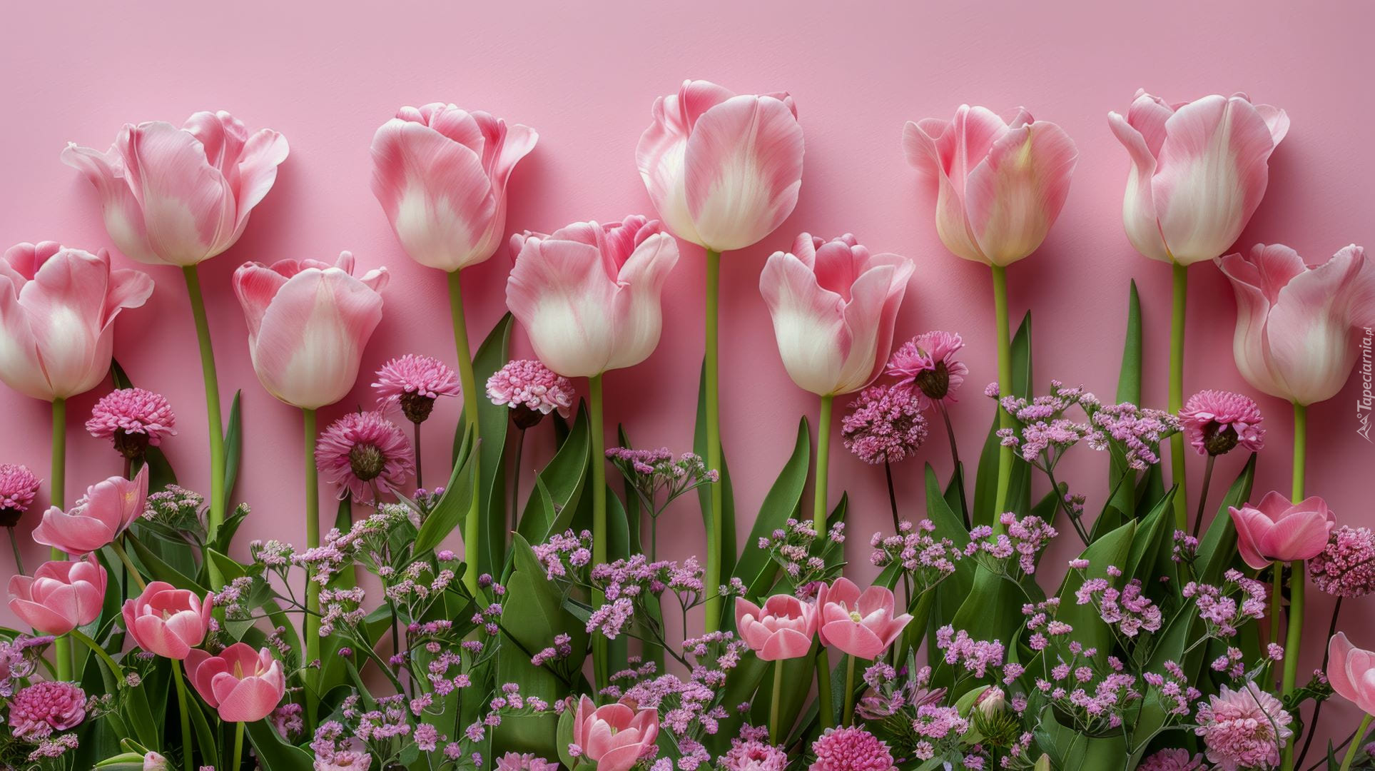 Edytor tapety: Tulipany i drobne kwiatki na różowym tle