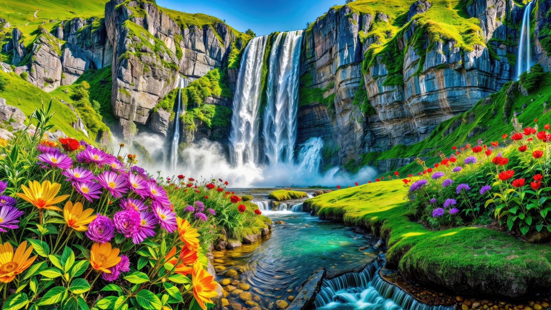 Edytor tapety: Skalny wodospad i rzeka wśród kolorowych kwiatów