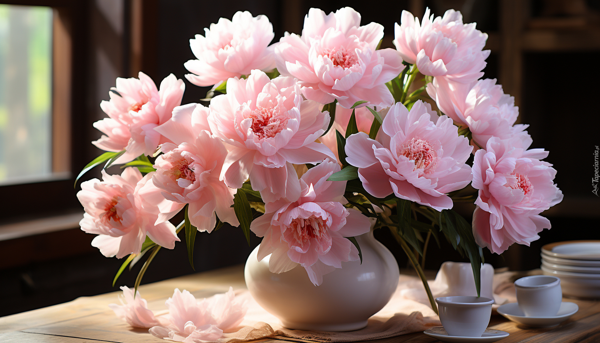 Edytor tapety: Filiżanki obok piwonii w wazonie na stole