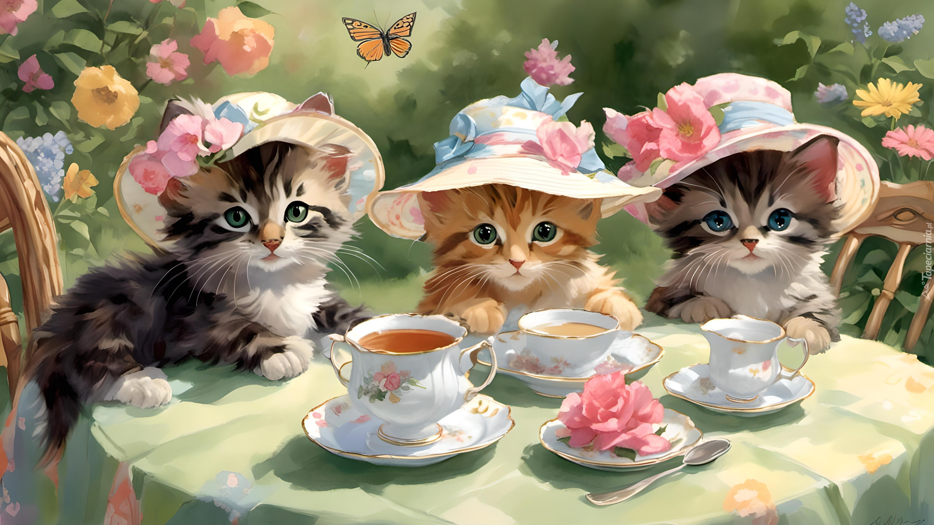 Edytor tapety: Trzy kotki w kapeluszach przy stole z filiżankami
