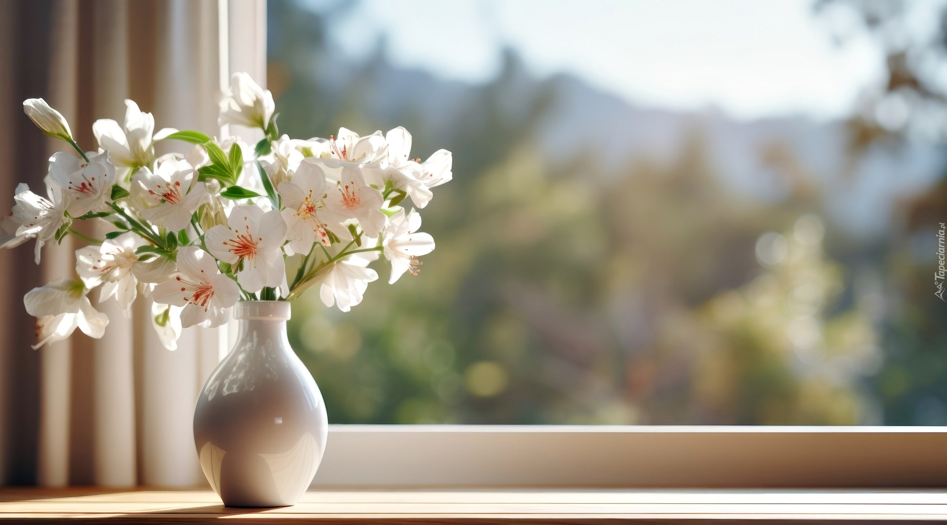 Edytor tapety: Bukiet białych kwiatów w wazonie przy oknie