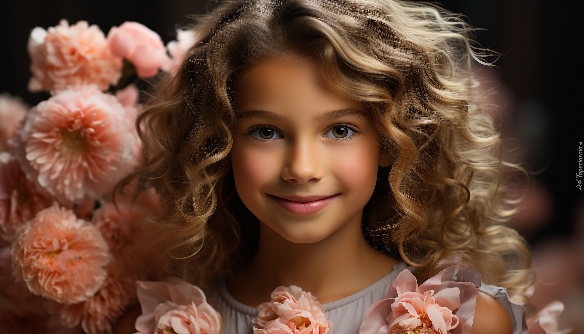 Edytor tapety: Różowe kwiaty i uśmiechnięta twarz dziewczynki