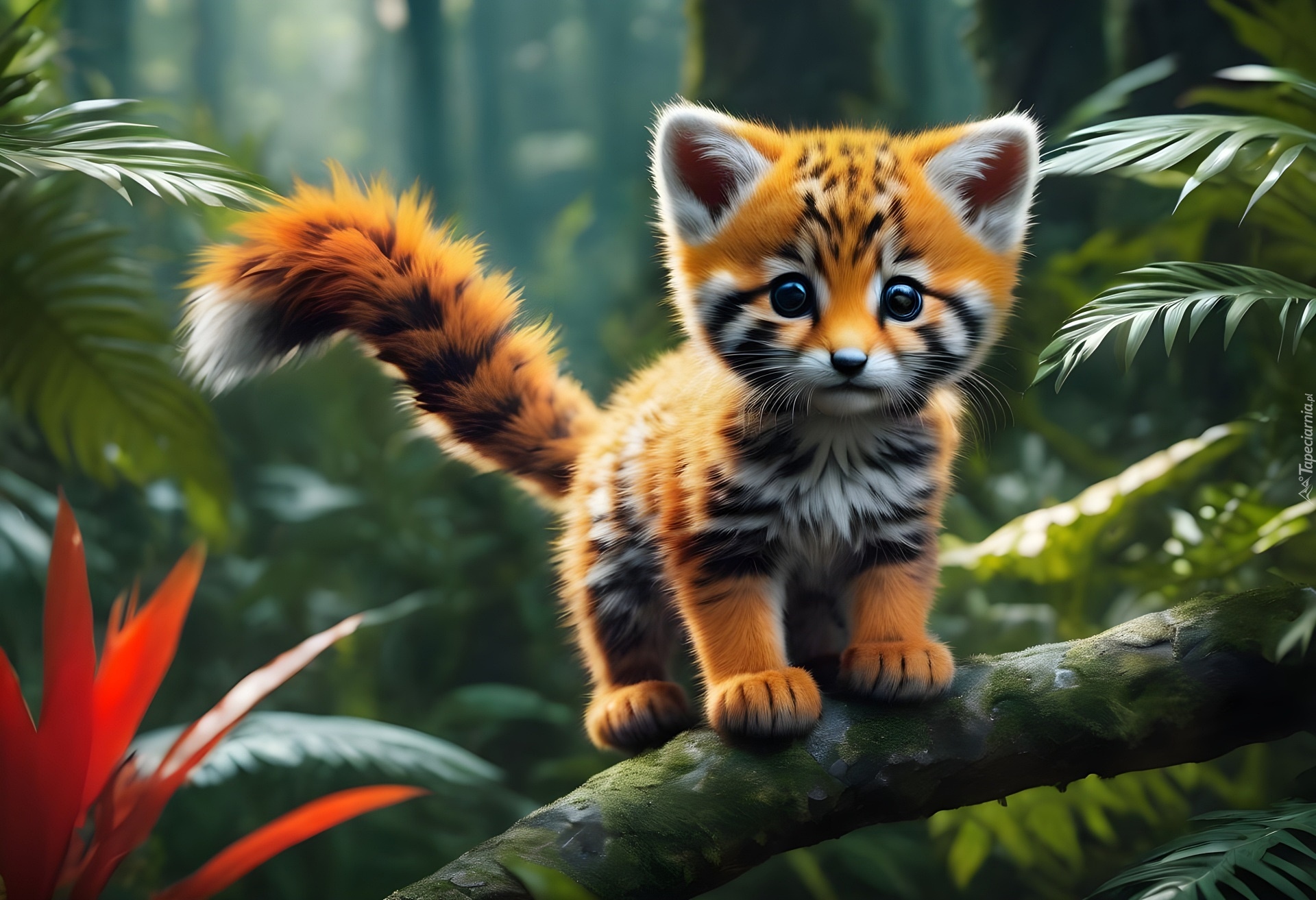 Edytor tapety: Mały dziki kotek na konarze drzewa w dżungli