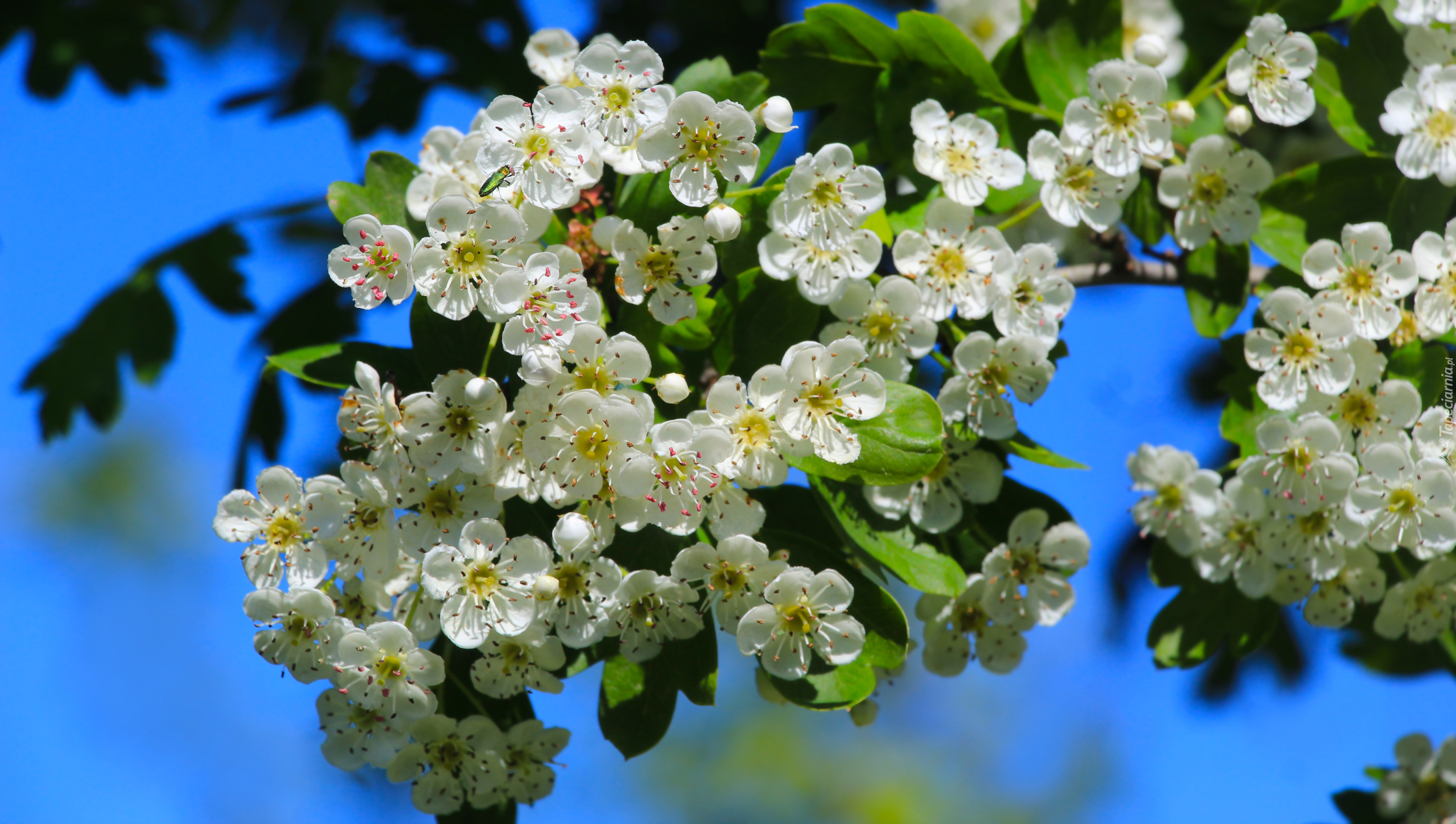 Edytor tapety: Gałązki głogu w rozkwicie na niebieskim tle