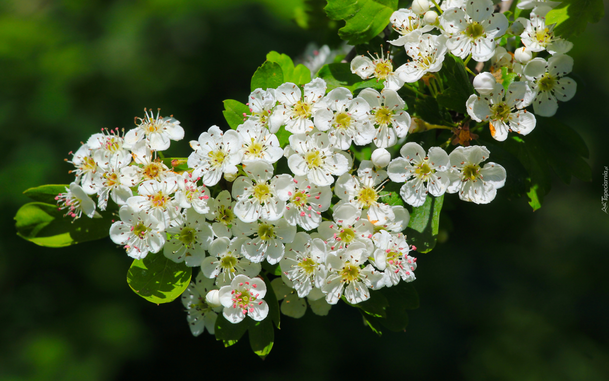 Edytor tapety: Gałązka kwitnącego głogu na zielonym tle