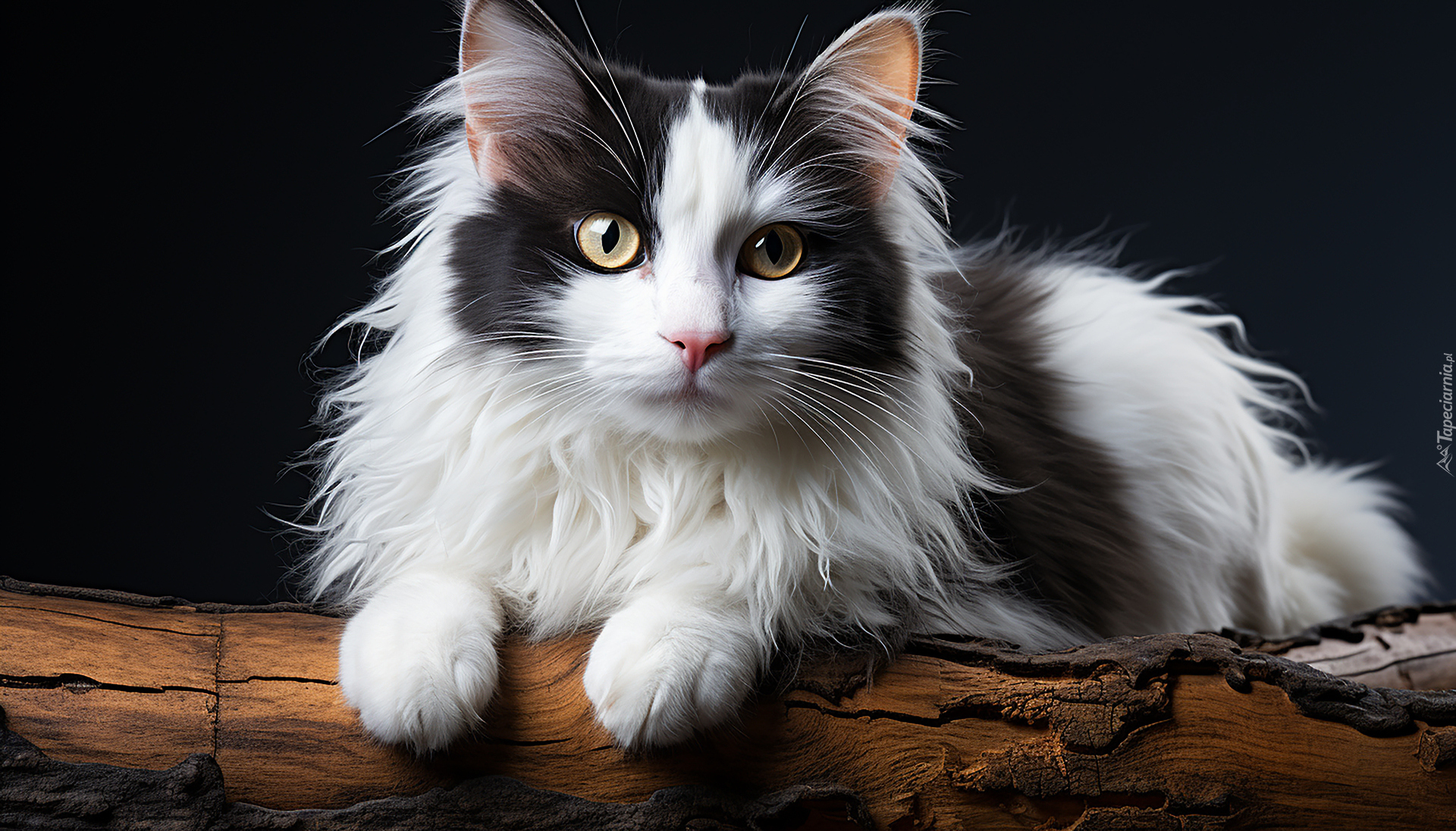 Edytor tapety: Biało-czarny puszysty kot na kłodzie