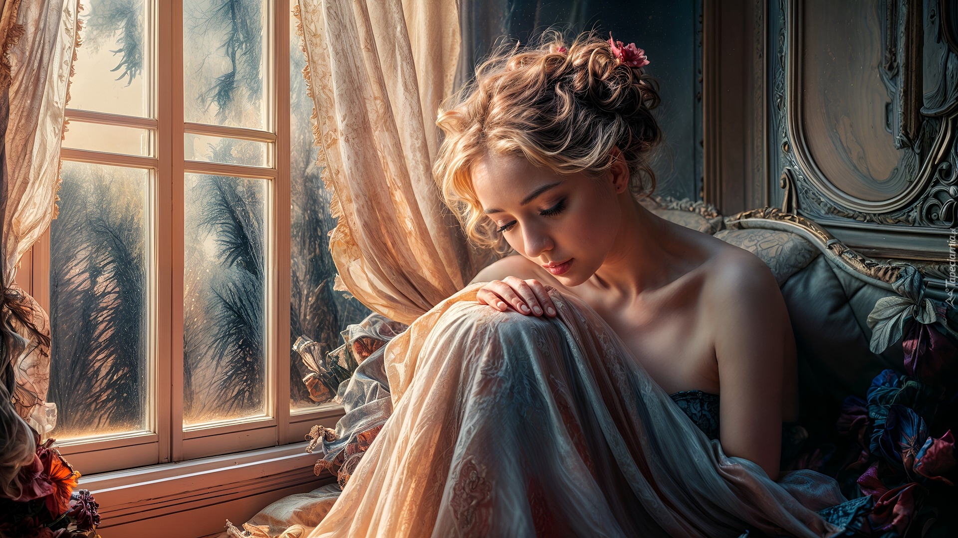 Edytor tapety: Smutna kobieta na fotelu przy oknie