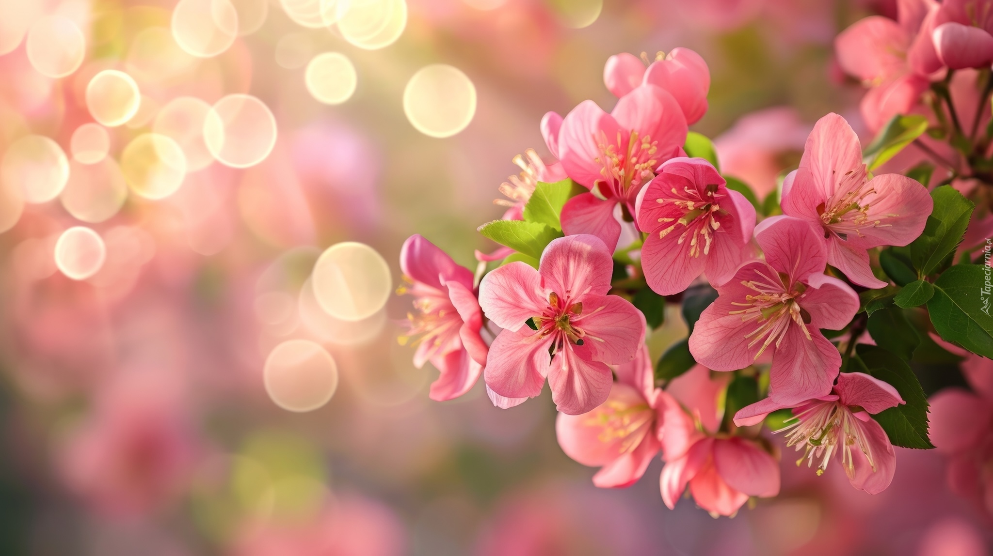 Edytor tapety: Rozświetlone różowe kwiaty drzewa owocowego