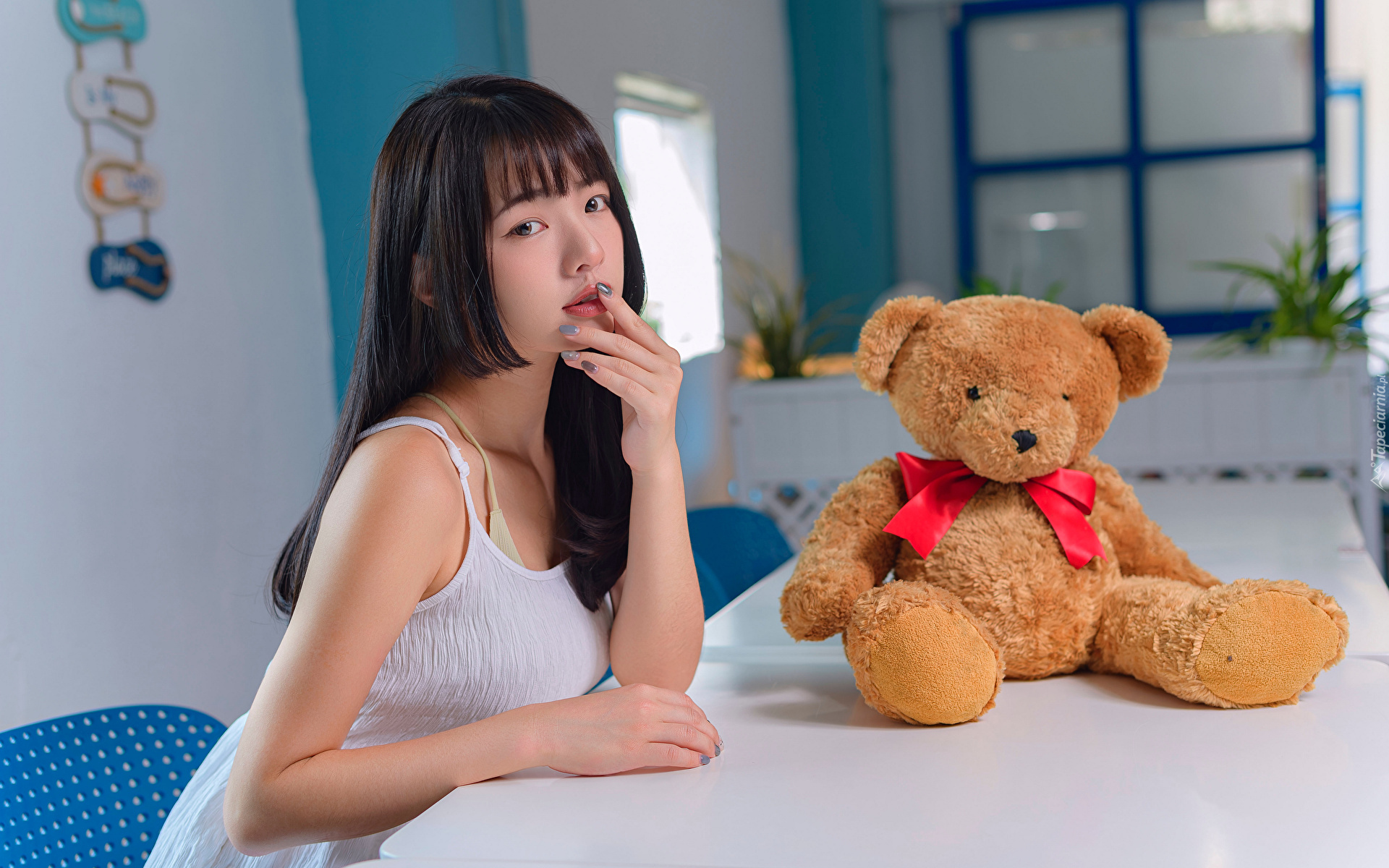 Edytor tapety: Azjatka i pluszowy miś na stole