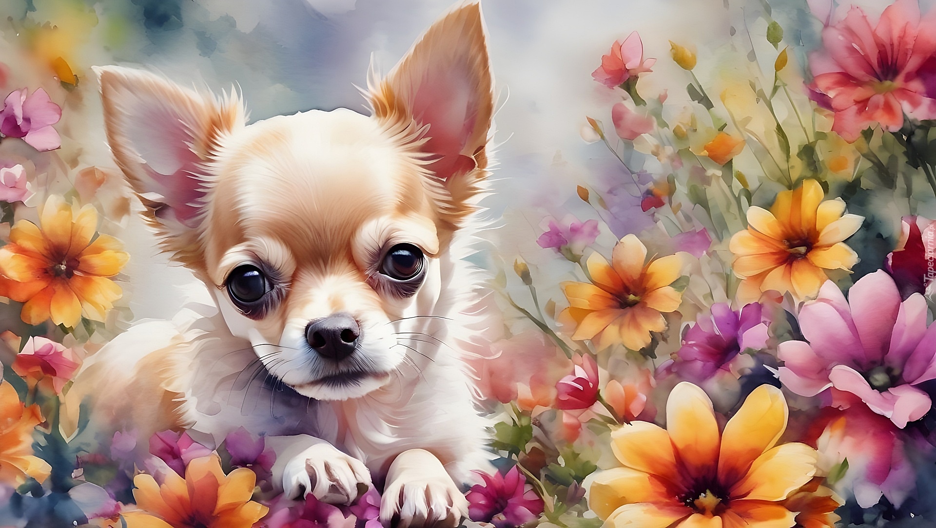 Edytor tapety: Szczeniak chihuahua i kolorowe kwiaty w grafice
