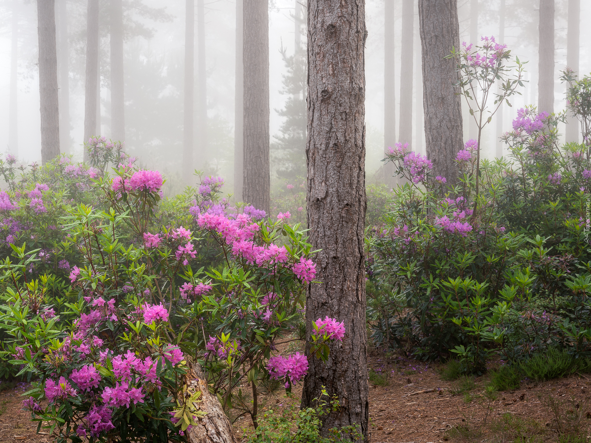 Edytor tapety: Różaneczniki pod drzewami w zamglonym lesie