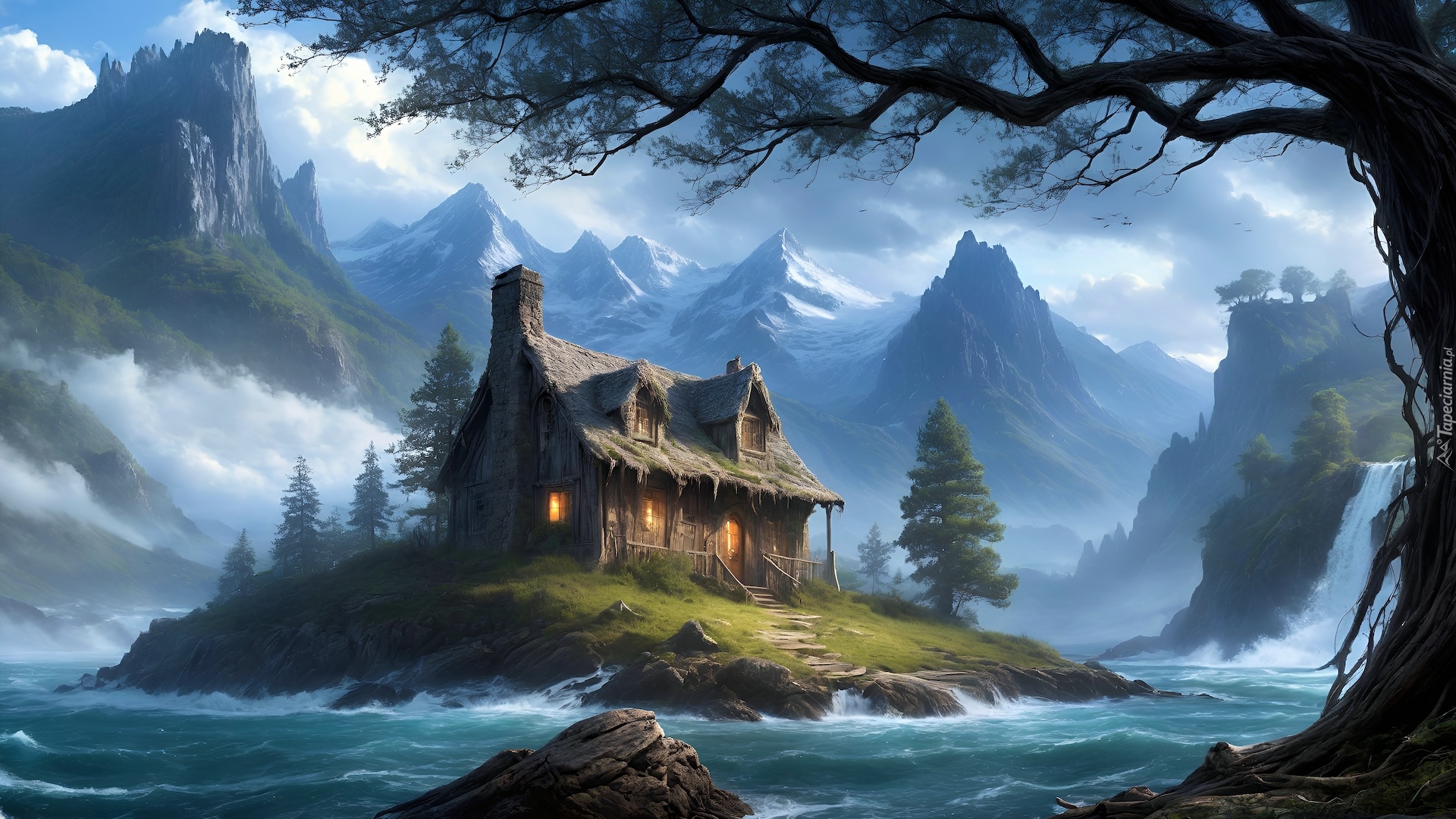 Edytor tapety: Dom na wyspie na jeziorze w górach