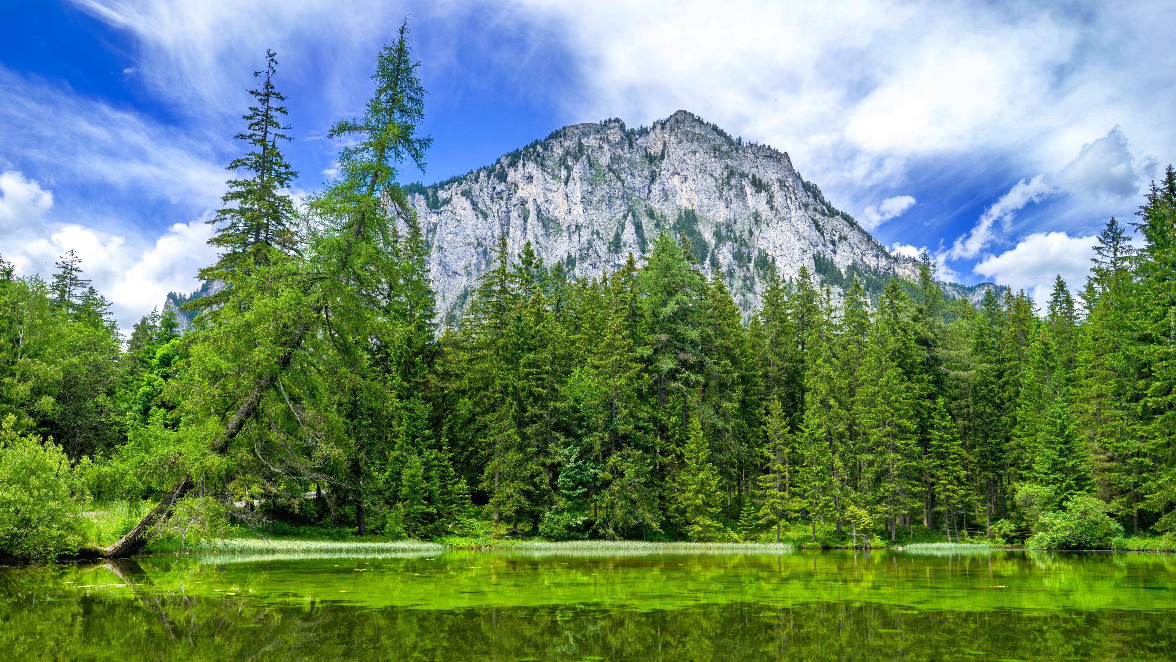 Edytor tapety: Drzewa iglaste na tle góry