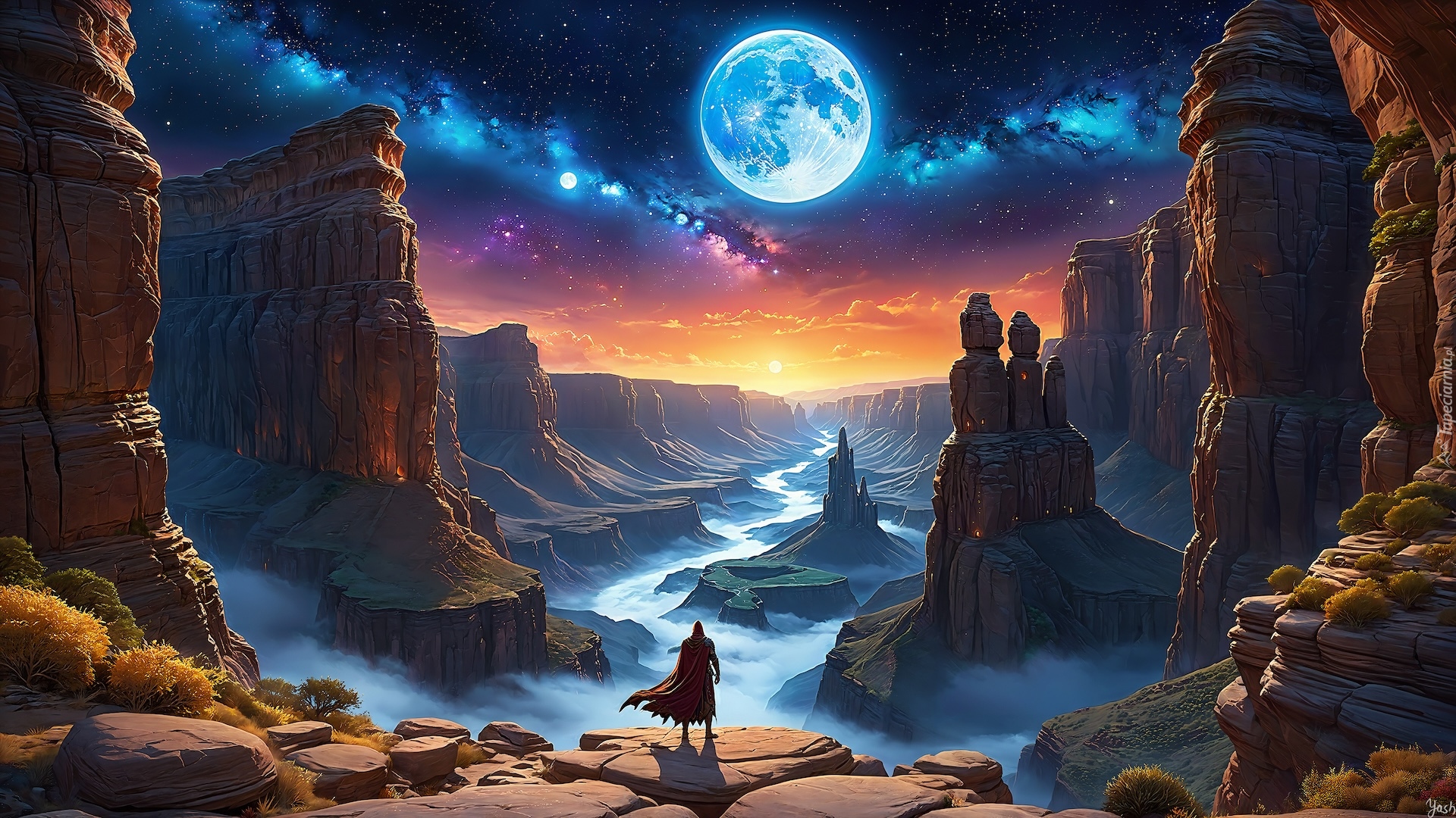Edytor tapety: Rzeka w wąwozie oświetlona blaskiem księżyca